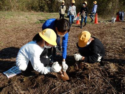 大切なハマナスを工事の影響の少ないところに移植する作業を、5年生が手伝いました。