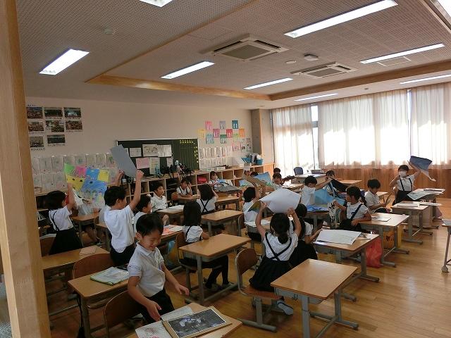 クラスごとに夏休みの宿題提出などを行いました。夏休み中の出来事を話したり、作品を見せ合ったりする姿が見られました。