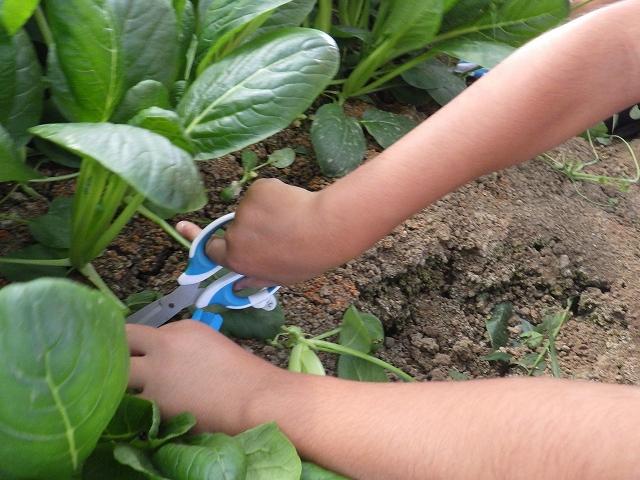 小松菜の摘み取りの体験もさせていただき、摘み取った小松菜をお土産にいただきました。嬉しそうに持ち帰った児童たちは、翌週の月曜日には、