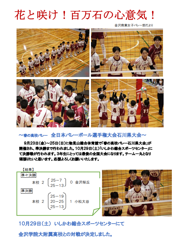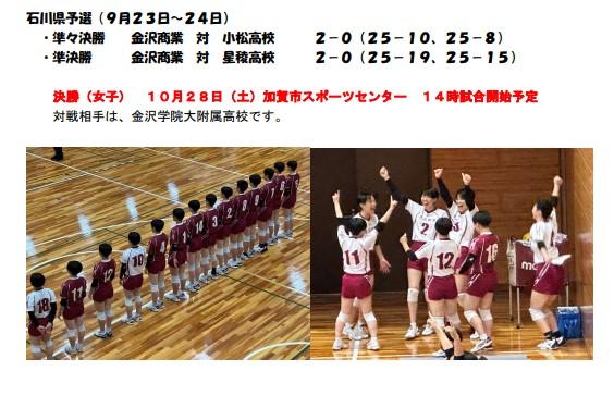 決勝戦は10月25日(土)いしかわ総合スポーツセンターで行われ、日本航空石川高等学校と対戦します。