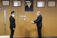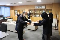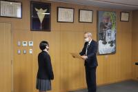 2月27日(土)、本校校長室にて、標記の賞を受賞した3年生チーム(3名)に対し、金沢大学融合学域先導学類の松島大輔教授より、賞状等が手渡されました。