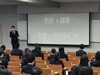 初めに校長先生より、「皆さんはとても勤勉で、ものごとを粘り強くやり抜くことができる生徒です。しかし、『勤勉であること』と『自分が勤勉であることをきちんと周囲に伝えられること』は違います。皆さんは、初対面の面接官に対して、自分の勤勉さ、粘り強さをどうアピールしますか?」など、面接で大切なことを問うかたちで激励の言葉がありました。