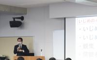 金沢中警察署生活安全課 坪田 大介 氏、石川県教育委員会事務局 学校指導課 主任指導主事 本田 淳也 氏をお招きし、「少年非行の実態」や「携帯電話・インターネット利用の危険性」についてお話しいただきました。お二方ともに、具体例や実際に起こった犯罪・トラブルの件数などを織り交ぜながら、とても分かりやすく説明してくださいました。