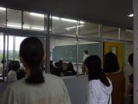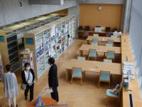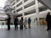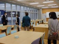 本校自慢のコミュニティコート(1~5階吹き抜け)や、ウッドデッキからの眺めが良い開放感のある5階ギャラリーなどの施設をご案内し、授業の様子を廊下からご覧いただいたあと「総合情報ビジネス科」特有の科目や行事などについて説明させていただきました。
