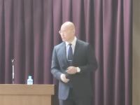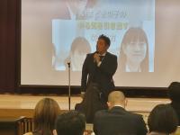 講師の飯山晄朗氏は、オリンピック金メダリストや高校運動部の全国優勝チームの指導で実績のあるメンタルトレーニングの専門家です。選手や社員を相手にした経験を交えた講演会に出席者は一生懸命にメモを取りながら参加しました。