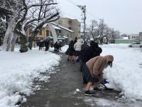 低温と大雪予報のための臨時休校が明けた1月26日(木)、朝7時ちょっと前に学校に到着すると、女子バレーボール部員4名が正門付近で雪かきをしてくれていました。