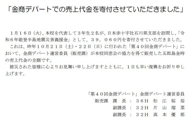 本校生徒が、昨年の11月に「兼六園ガイド」を担当させていただいた白梅学園高等学校のみなさまから、お見舞いのメッセージとお見舞いのお品が届きました。