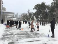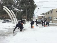 きょうの除雪当番は14Hの皆さん。担任の小坂先生と一緒に、正面玄関前や来客用駐車場を雪かきしてくれました。