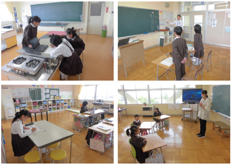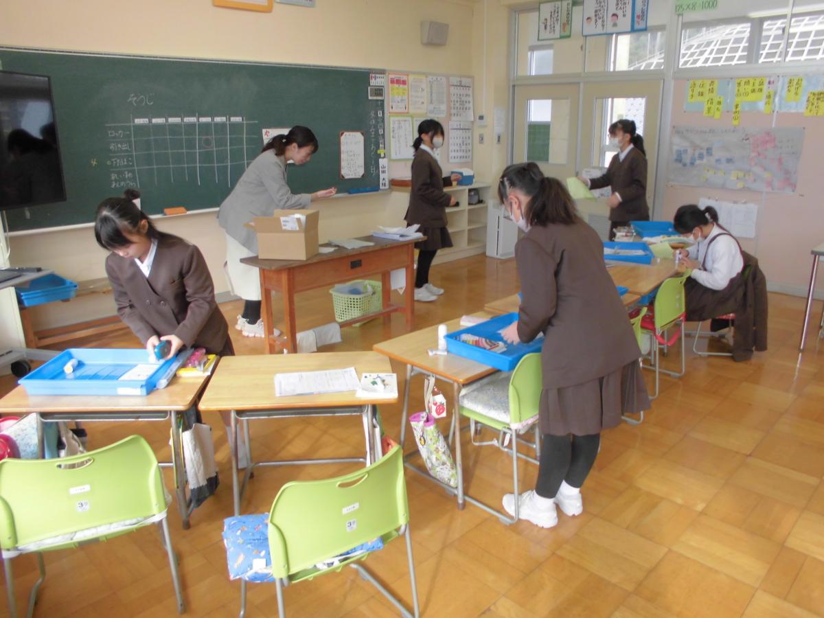 4限目の様子を見に行くと、1・2年生は学級活動、明日1限目のお楽しみ会に向けた掲示をがんばっていました。3人協力してがんばっている姿に花丸◎!3年生は理科、電流のはたらきの学習です。電池と豆電球を使って、どうしたら灯りがつくかを実験していました。5年生は家庭、次時から始まるナップサックづくりに向けて、準備の確認をしていました。さてどんなナップサックができあがるか楽しみですね!