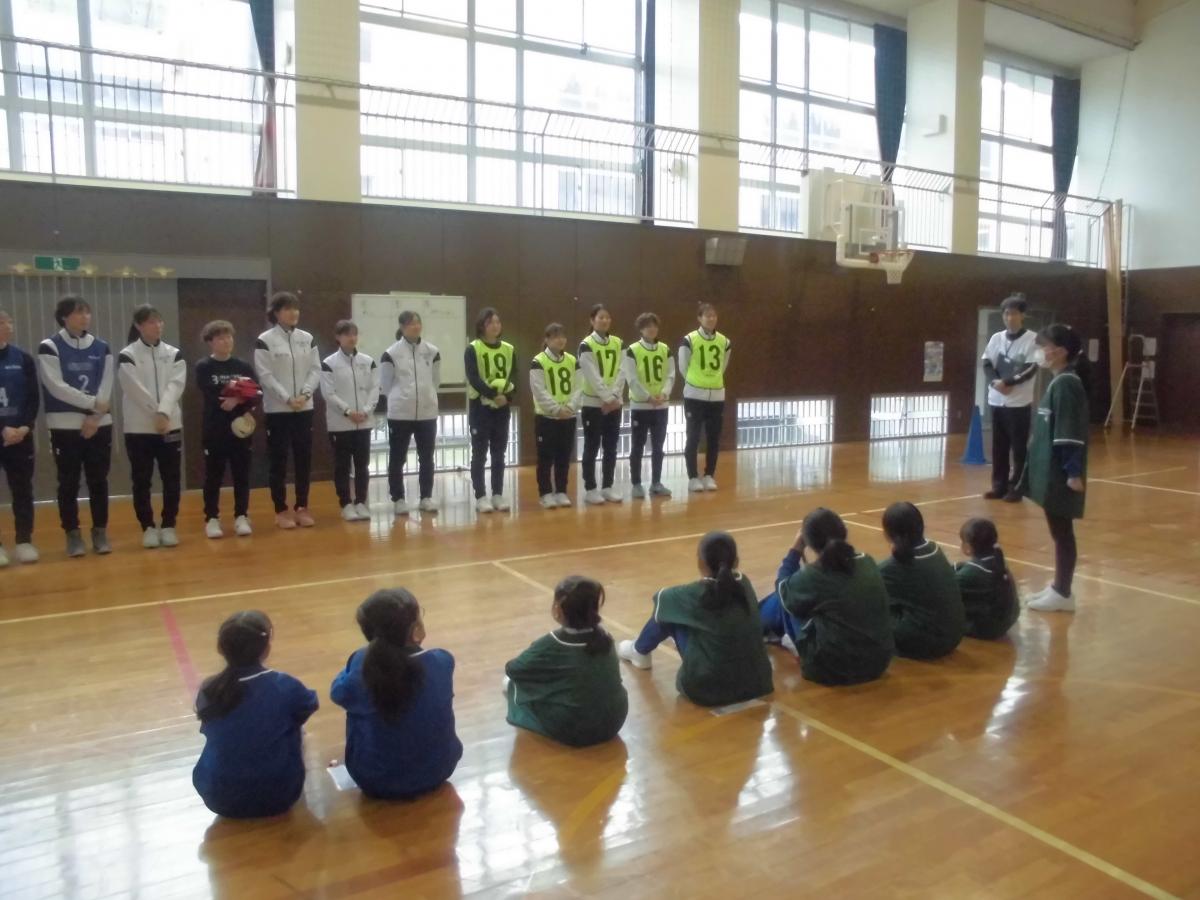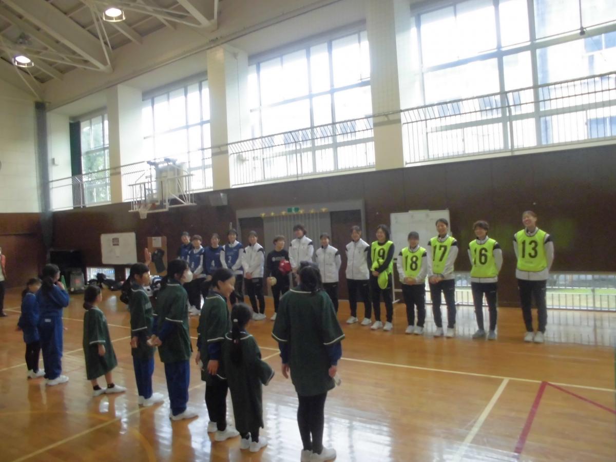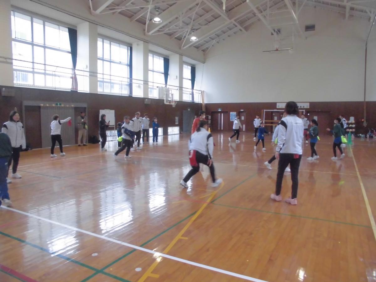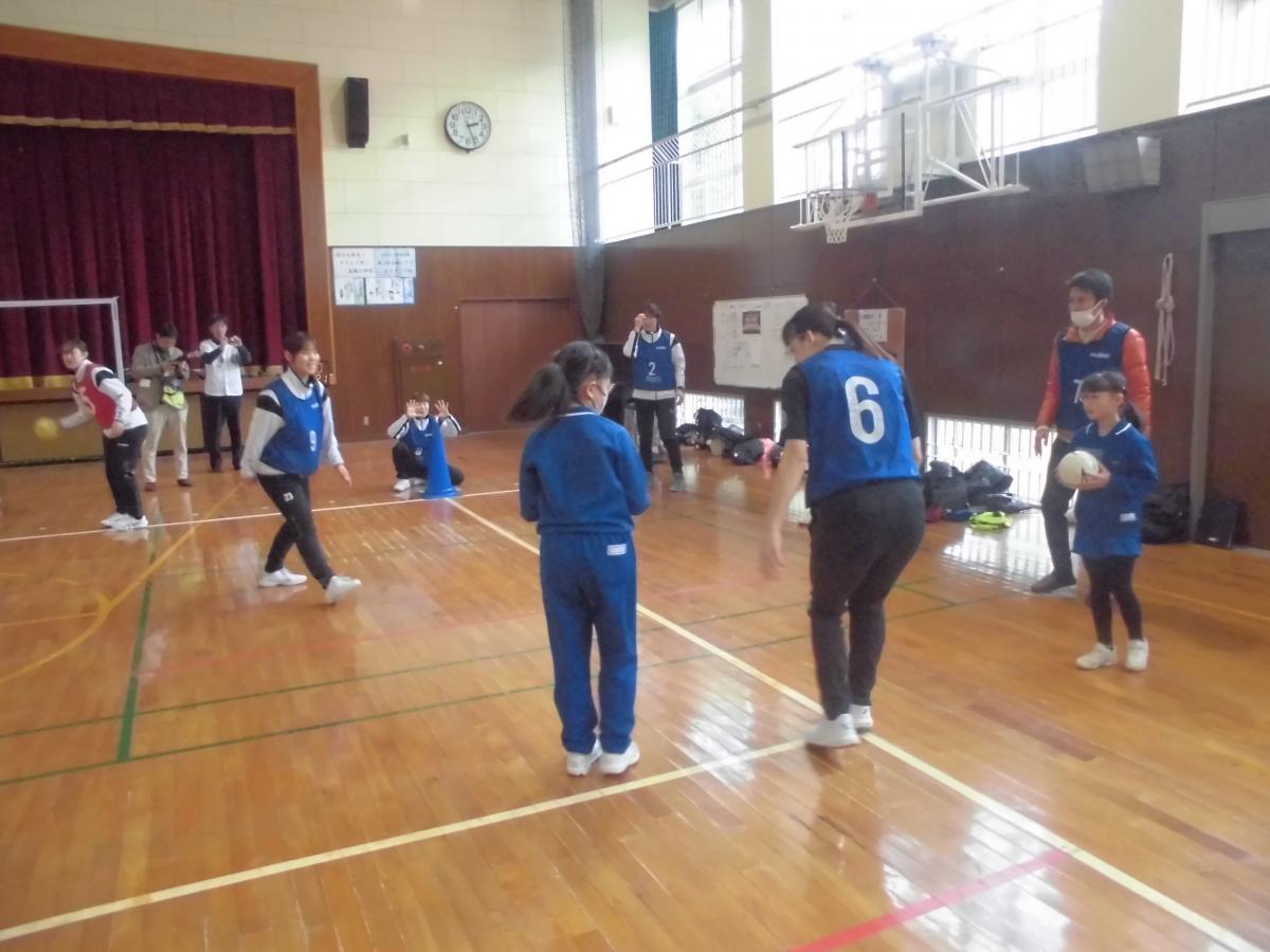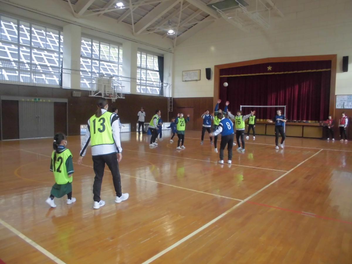2限目までの学習を終えた子どどもたちは、待ちきれない様子で体育館に集合。予定より5分早くスポーツ教室が始まりました。最初は永田選手からの自己紹介や講話でした。福井市出身で、17年間ハンドボールを行って来られたこと。ハニービー石川として10連覇すべてを経験した唯一の選手であること。日本代表として、東京・パリ五輪出場に向けて挑戦したこと等、聞き入ってしまうとってもすてきなお話でした。その後はスポーツ教室。こおり鬼やボールを使ったウォーミングアップの後は、パスの仕方やジャンピングシュートの仕方を教えていただき、最後は2チームに分かれてのゲームです。思いっきり走り回ることの楽しさを感じた素敵な時間となりました。