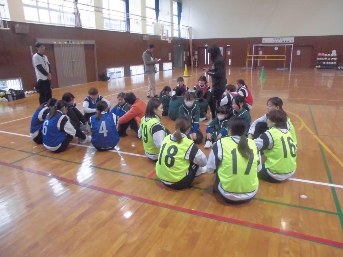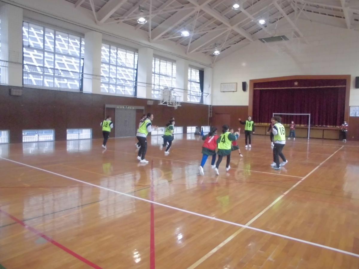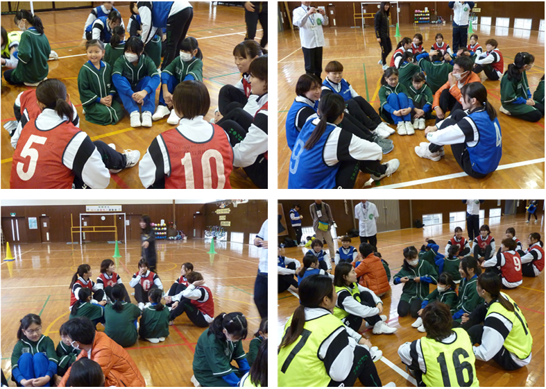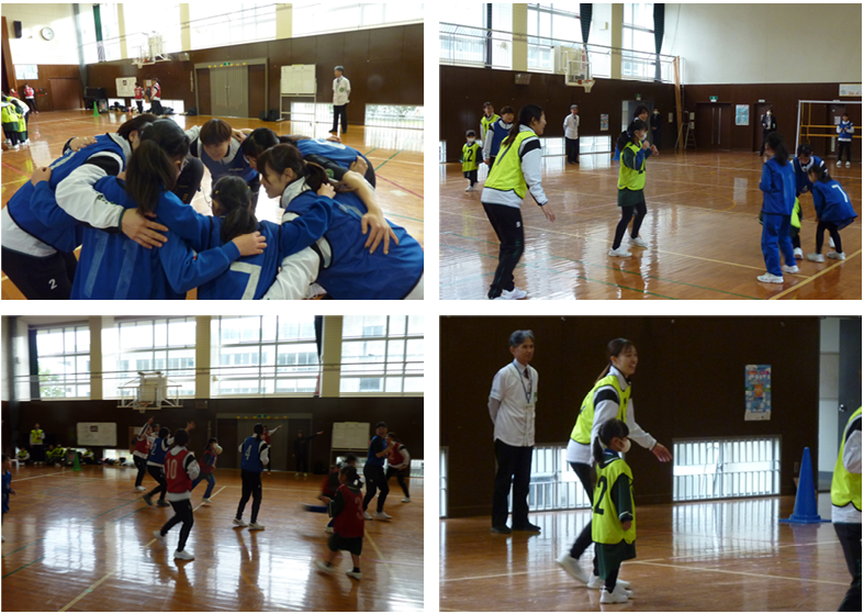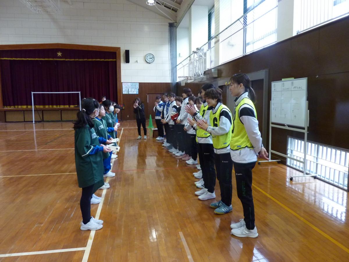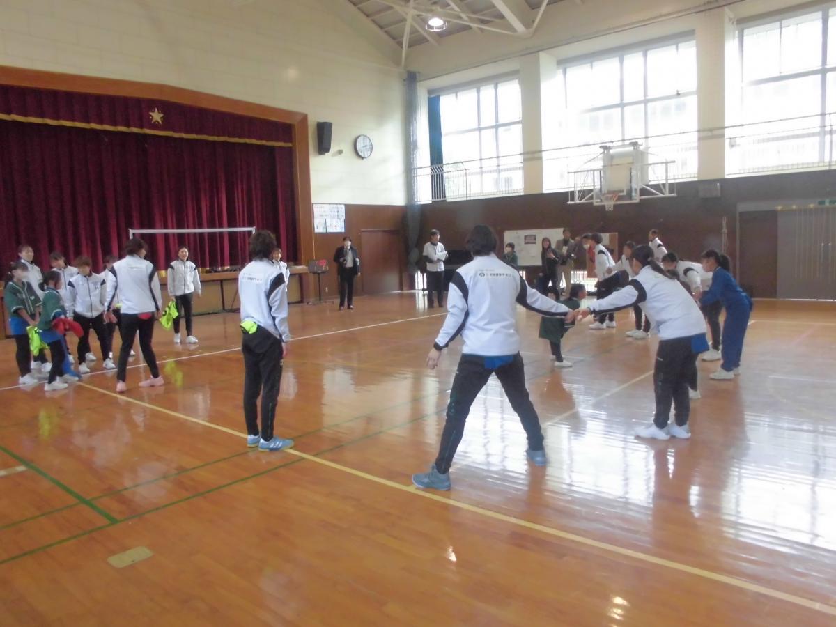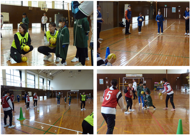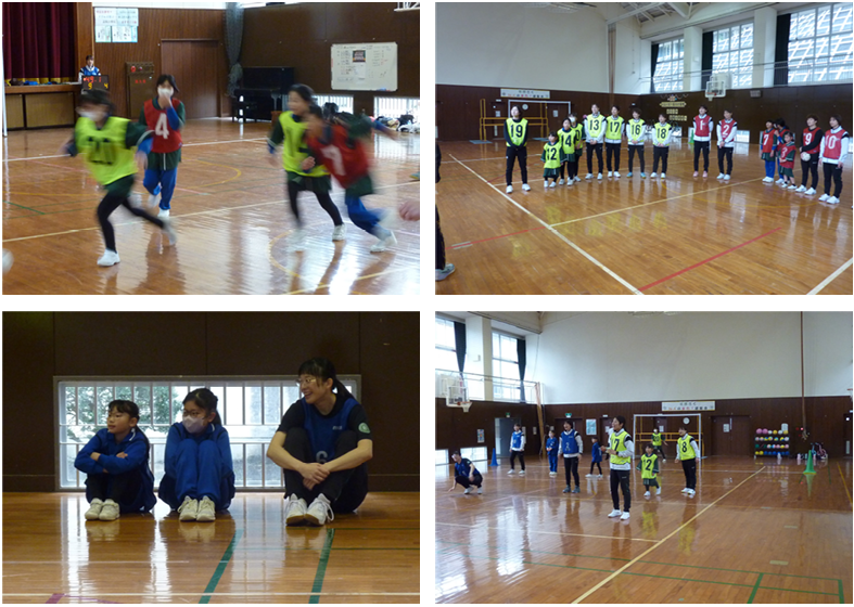 2限目までの学習を終えた子どどもたちは、待ちきれない様子で体育館に集合。予定より5分早くスポーツ教室が始まりました。最初は永田選手からの自己紹介や講話でした。福井市出身で、17年間ハンドボールを行って来られたこと。ハニービー石川として10連覇すべてを経験した唯一の選手であること。日本代表として、東京・パリ五輪出場に向けて挑戦したこと等、聞き入ってしまうとってもすてきなお話でした。その後はスポーツ教室。こおり鬼やボールを使ったウォーミングアップの後は、パスの仕方やジャンピングシュートの仕方を教えていただき、最後は2チームに分かれてのゲームです。思いっきり走り回ることの楽しさを感じた素敵な時間となりました。