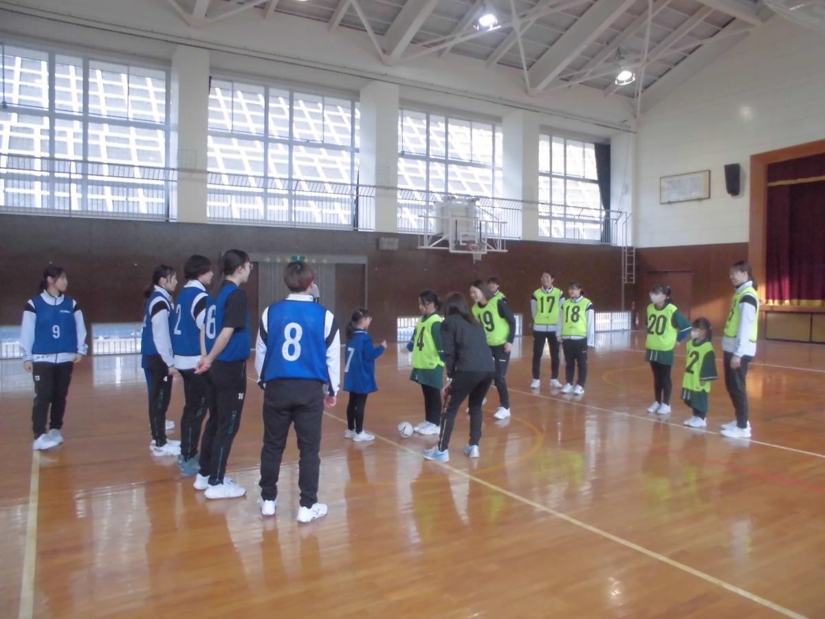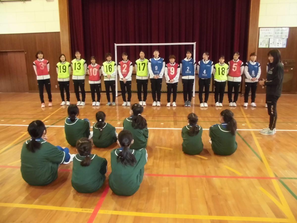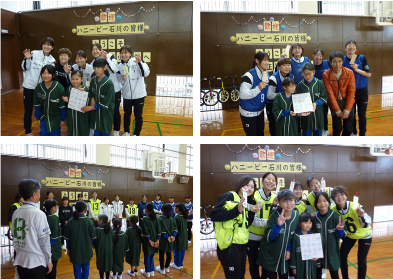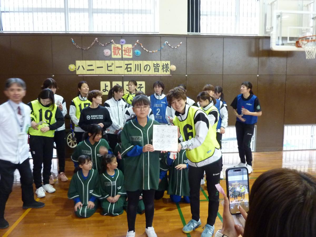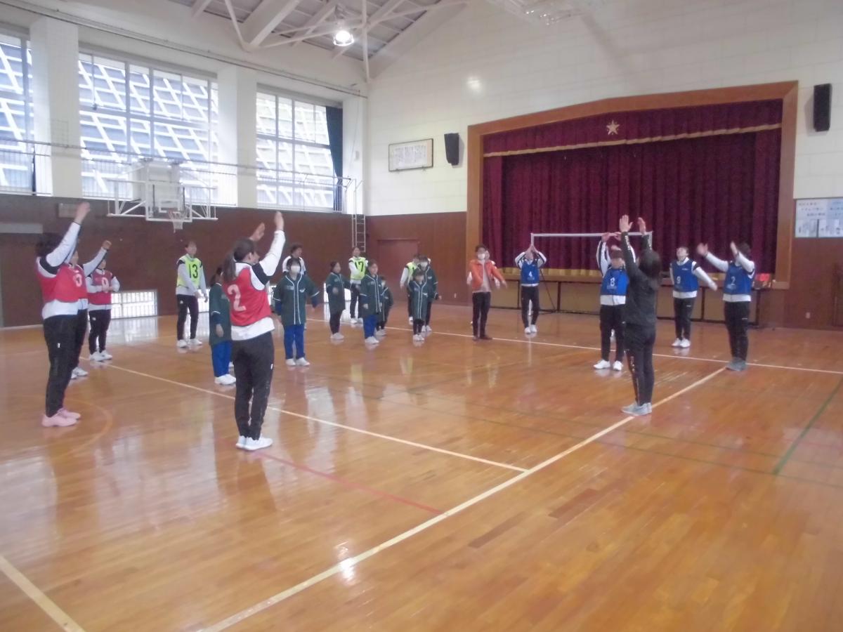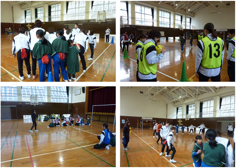 2限目までの学習を終えた子どどもたちは、待ちきれない様子で体育館に集合。予定より5分早くスポーツ教室が始まりました。最初は永田選手からの自己紹介や講話でした。福井市出身で、17年間ハンドボールを行って来られたこと。ハニービー石川として10連覇すべてを経験した唯一の選手であること。日本代表として、東京・パリ五輪出場に向けて挑戦したこと等、聞き入ってしまうとってもすてきなお話でした。その後はスポーツ教室。こおり鬼やボールを使ったウォーミングアップの後は、パスの仕方やジャンピングシュートの仕方を教えていただき、最後は2チームに分かれてのゲームです。思いっきり走り回ることの楽しさを感じた素敵な時間となりました。