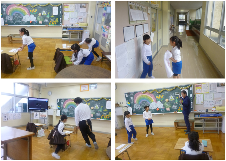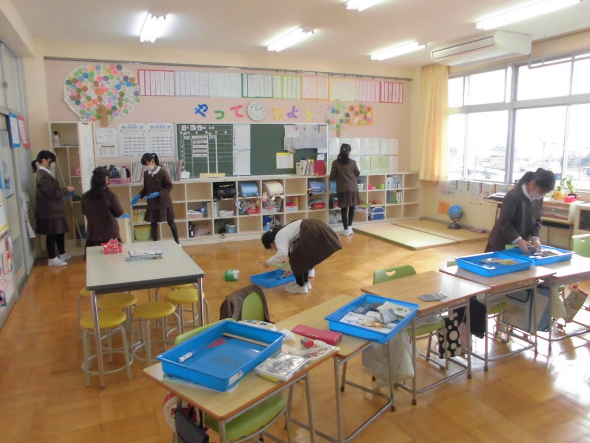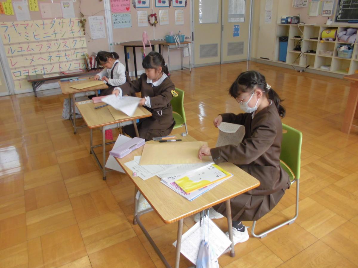 4限目の様子を見に行くと、3・5年生は教室の大掃除に取り組んでいました。手袋と雑巾を使って、お世話になった机やロッカーをきれいに磨く姿が見られました、花丸◎!1・2年生は冬休みのお話。冬休みの宿題を1つ1つ確認して封筒に入れる姿が見られました、花丸!