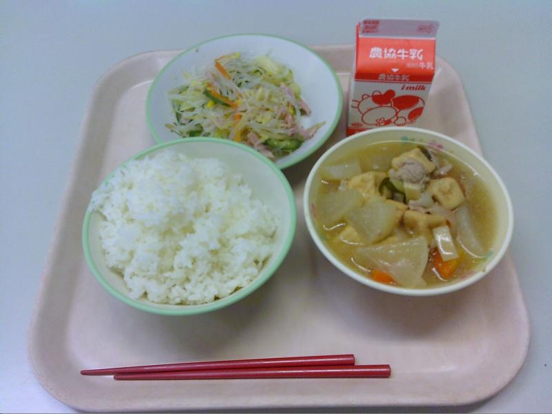 本日の献立は、ごはん・春雨サラダ・珠洲産大根の中華煮・牛乳でした。大根は調理方法によって健康効果が変わります。生の場合、消化酵素やビタミンCなどが取られますが、火を通すとこれらの栄養素が壊れてしまいます。消化の良さや食物繊維・カリウムなどの効果を得るにはの物が一番適してるそうです。煮汁やスープも飲むようにすると大根から溶けだした栄養素もむだなく摂取できるとのこと。今日もおいしくいただきました!
