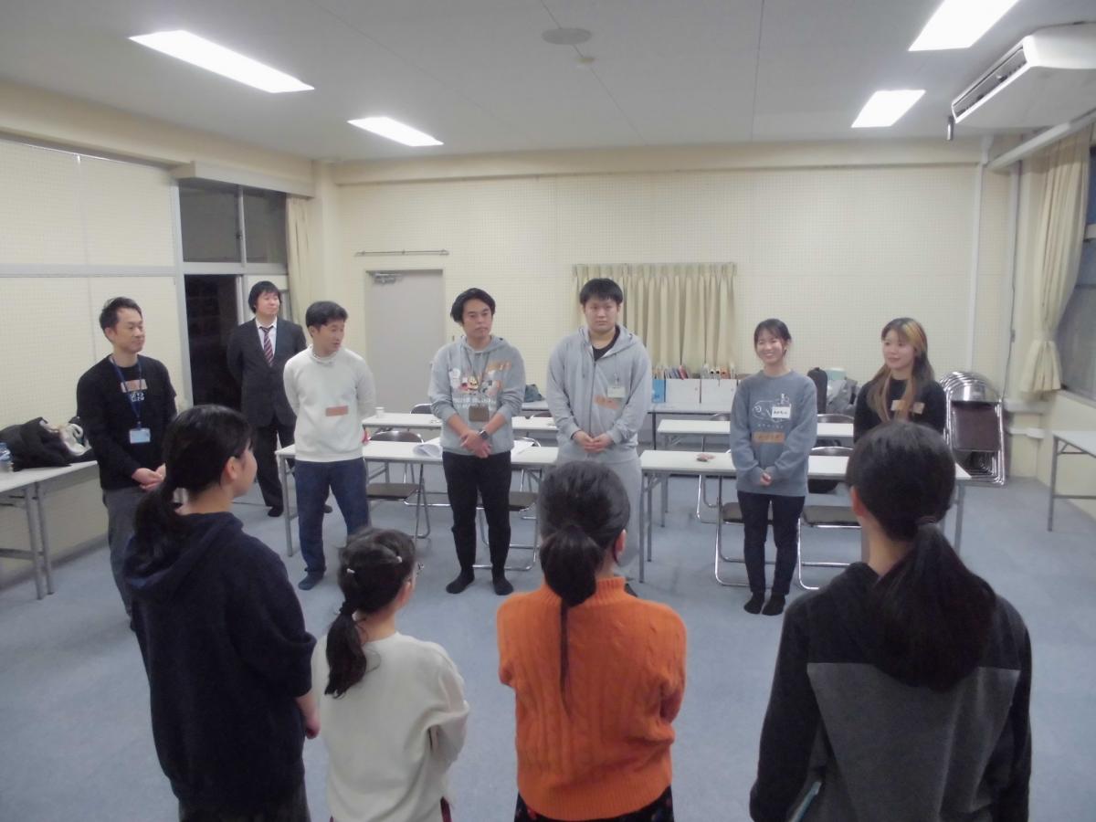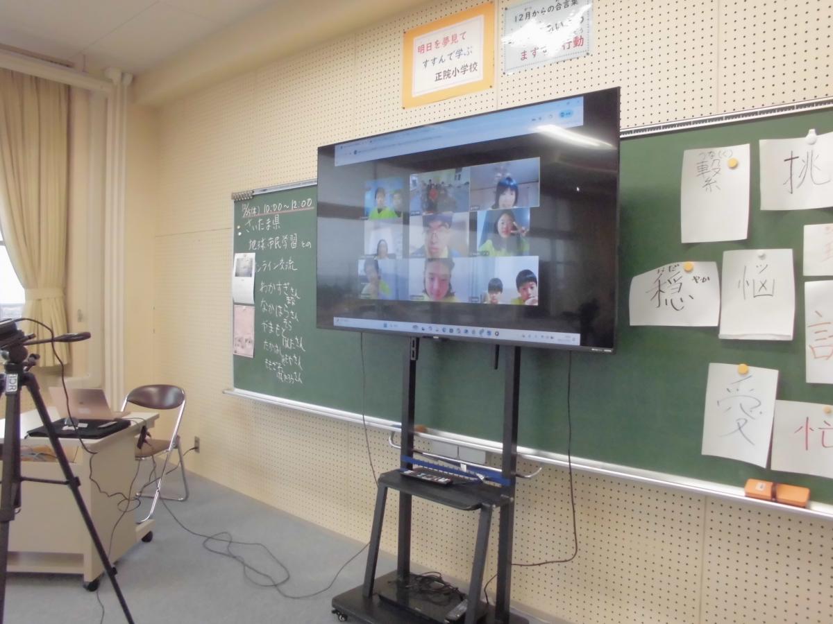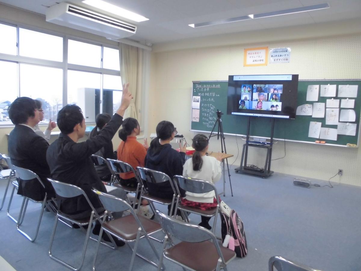 早い児童は8時には登校、みんなが来る9時30分ごろまでは職員室で、担任の先生にご指導いただきながら、冬休みの宿題に取り組んでいました。9時過ぎには、松井准教授が来校され、遅れて5名の学生の皆さんが来校されました。9時30分過ぎには他の児童や中学生が来校。10時より、松井先生や学生の皆さんも加わっての地球市民学習さんとのオンライン交流を行いました。