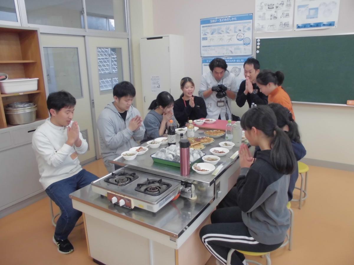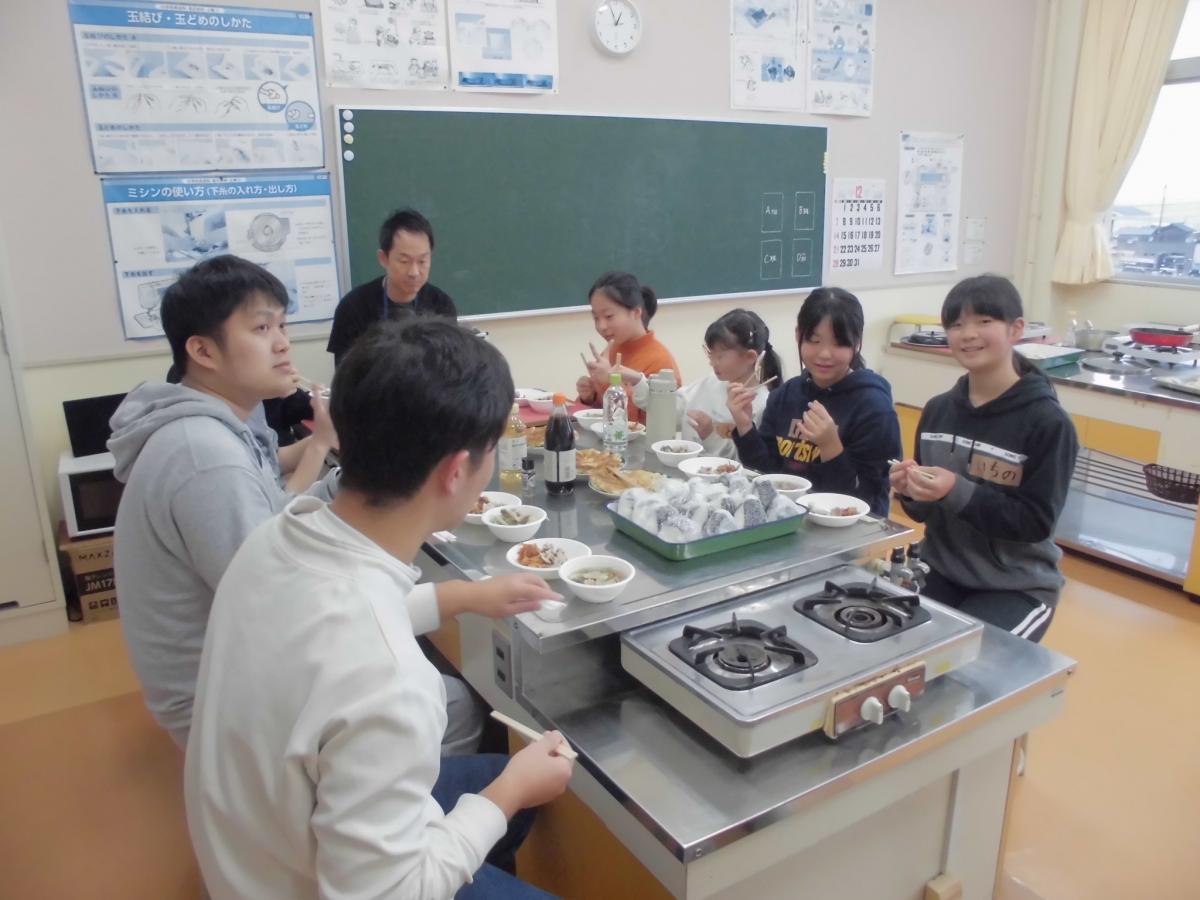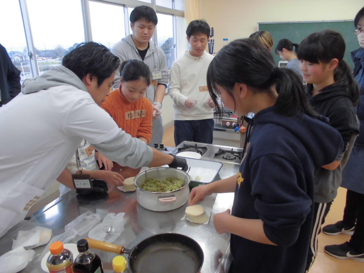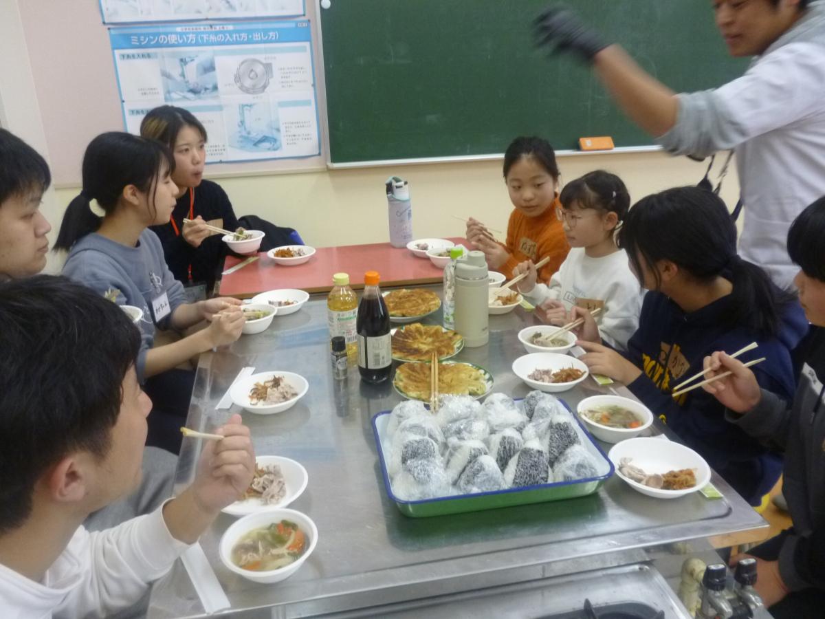 学生のお一人のご実家が中華料理屋さんであることから、一緒に餃子づくり!家でも作ったことのある児童もいたようでしたが、楽しんで作ることができました!焼きは学生さんにお任せし、みんなでおにぎりと豚汁と餃子のランチをいただきました。炊いたお米は、今年2月に万博出前授業にご来校下さった、映画監督・河瀬直美さんから届いたお歳暮、直美米を使わせていただきました。またしょうゆやポン酢は、今日のギョーザのたれに使わせていただきました。