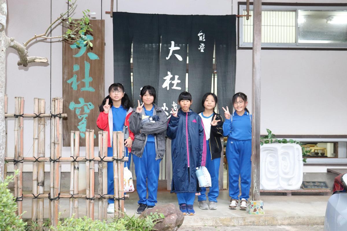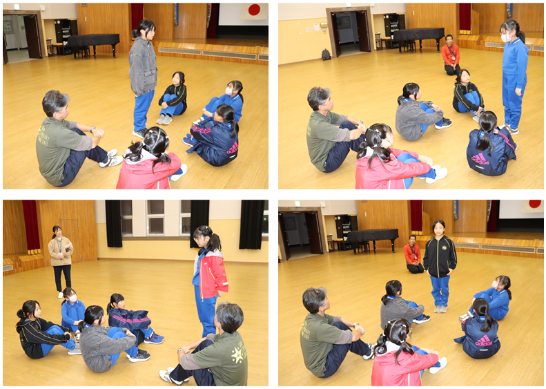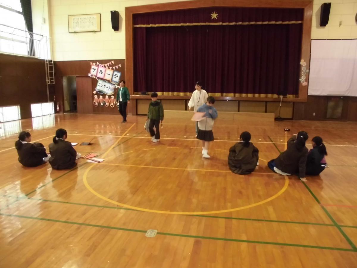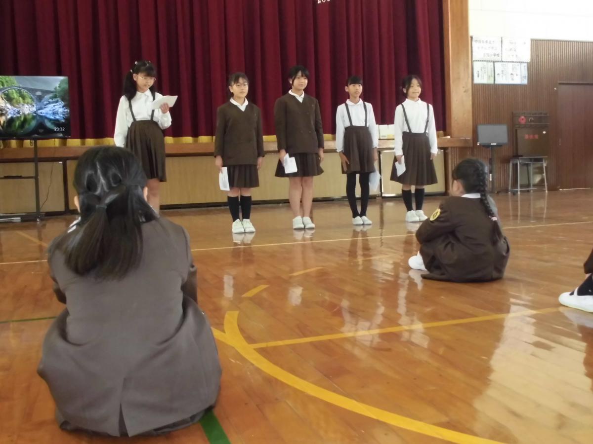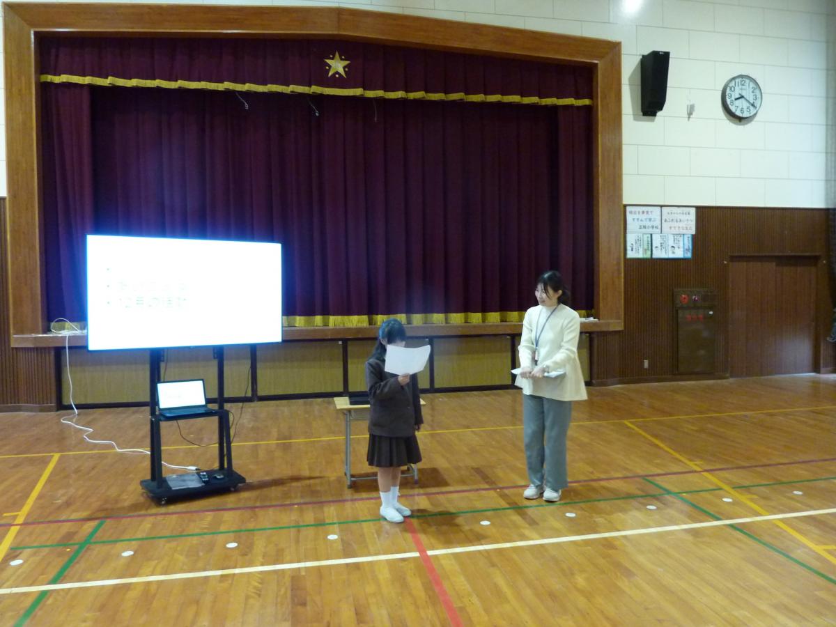 次は各校の学校紹介です。本校の5年生5名は全員で分担して、正院小学校クイズを3問出題しました。附属中の皆さんは楽しんで考え挙手してくれました!附属中学校の皆さんは、昨日活動の様子を話してくれました。例年京都に行っている修学旅行を、今年は震災復興を学ぶために能登に来たこと、昨日は正院公民館で館長さんのお話を聞いたことを話してくれました。2つの団体のつながりを感じる素敵な時間になりました!