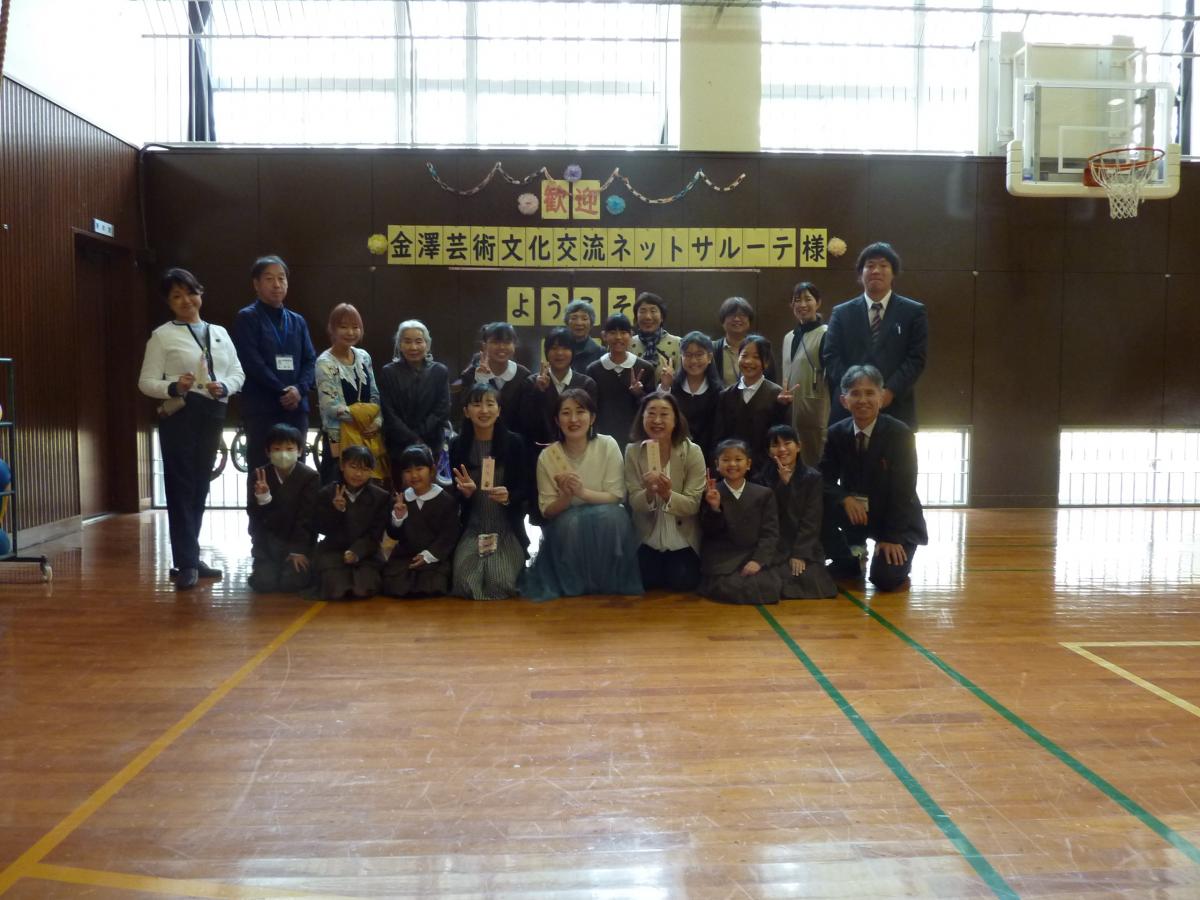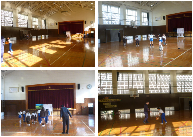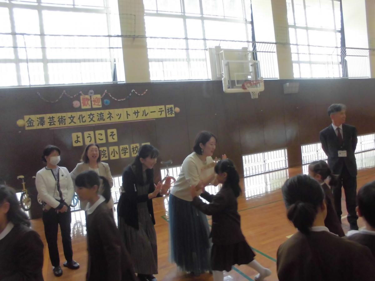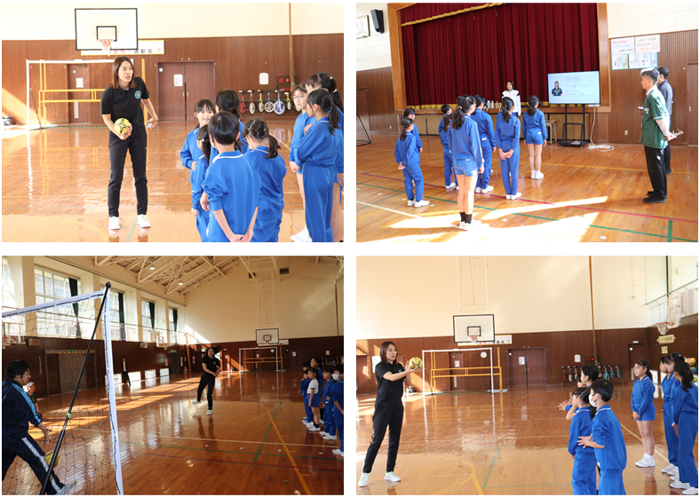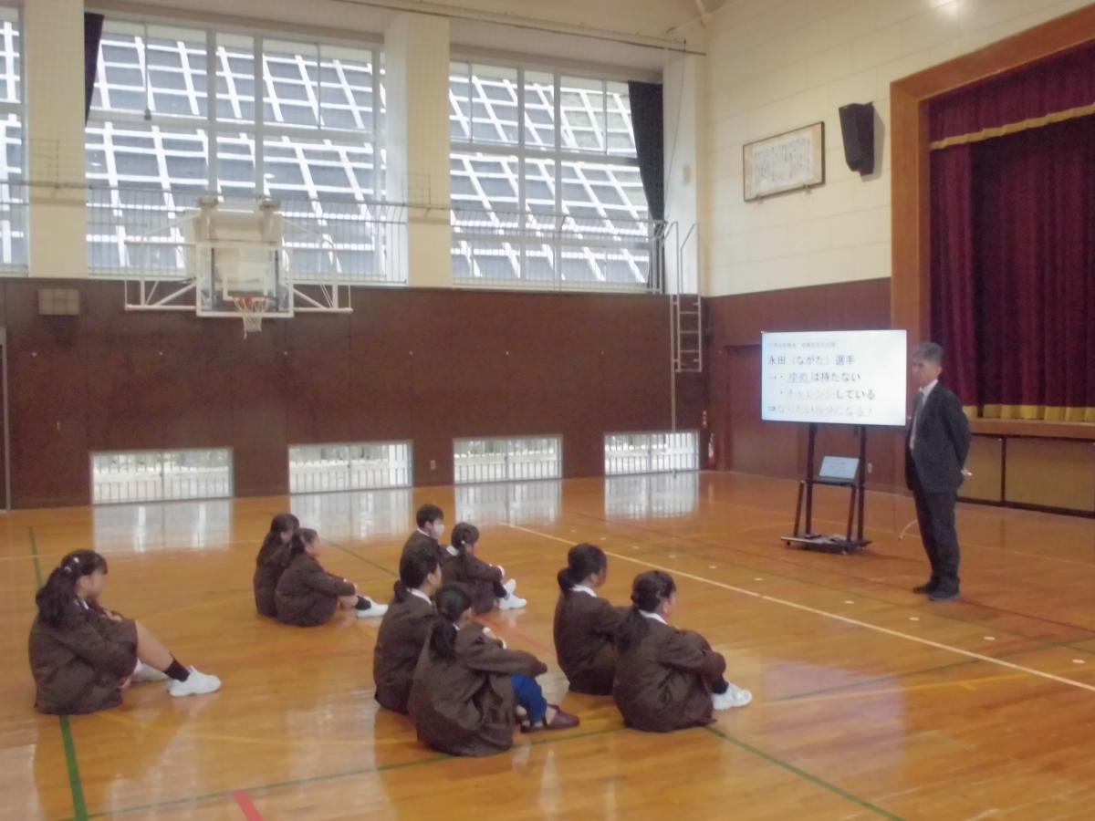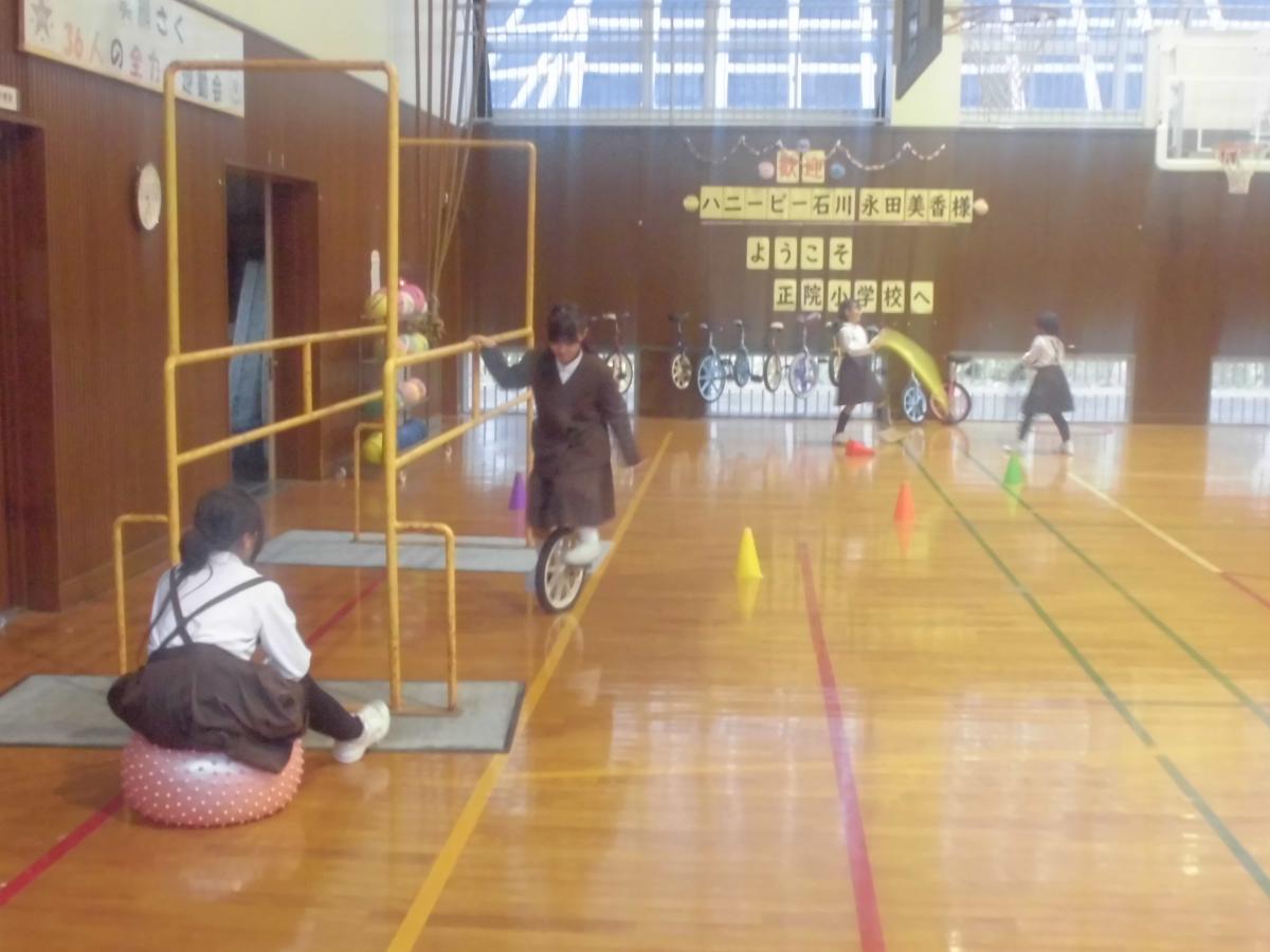 午後からはハニービー石川の皆さんが来校し、子どもたちとスポーツ教室の予定。午後1時10分頃、16名で来校された皆さんは、すぐ体育館に入り準備をされていました。