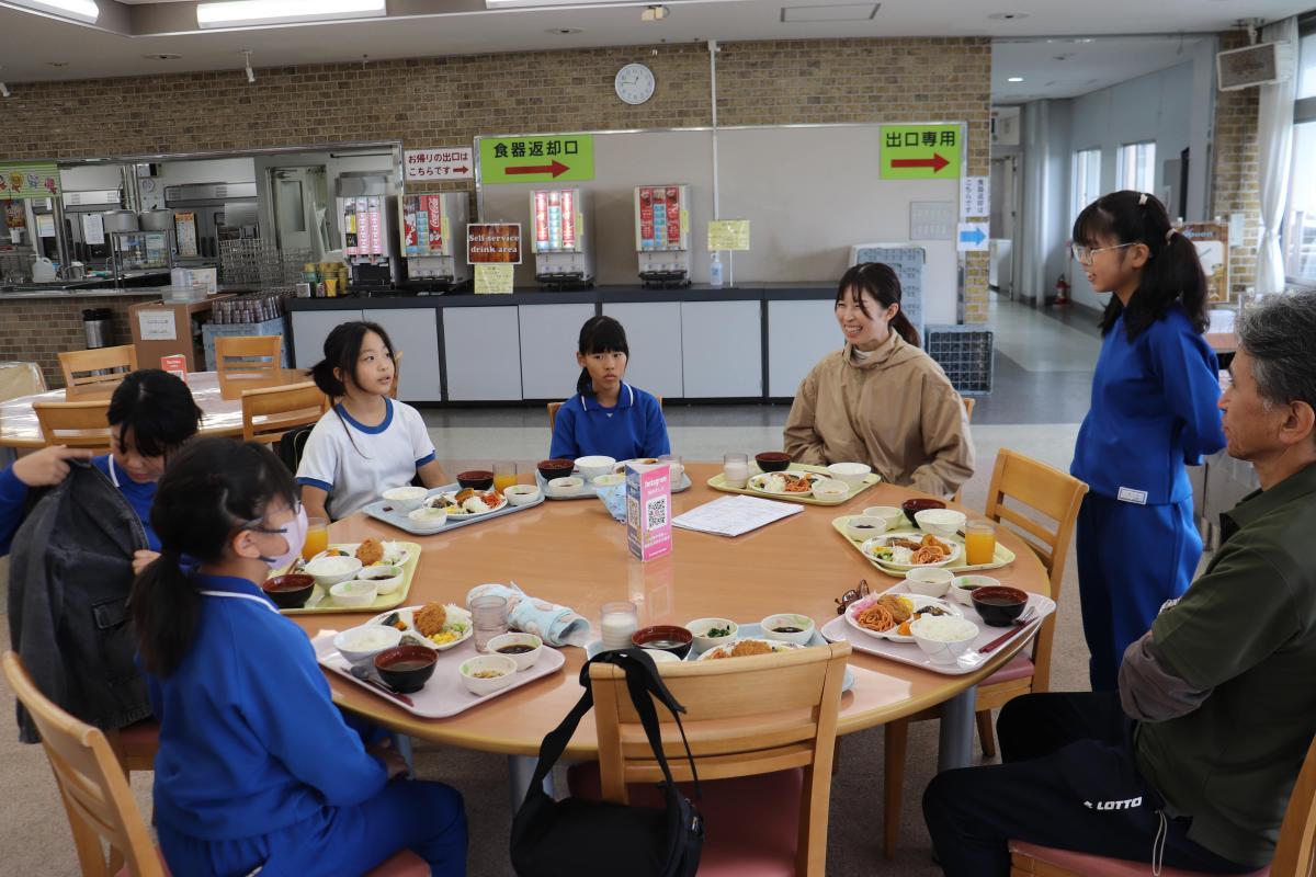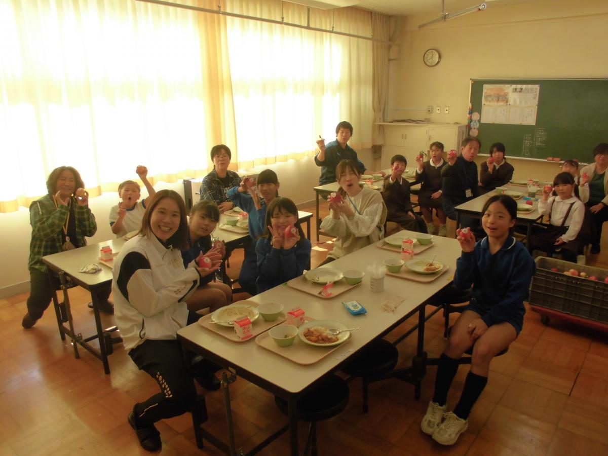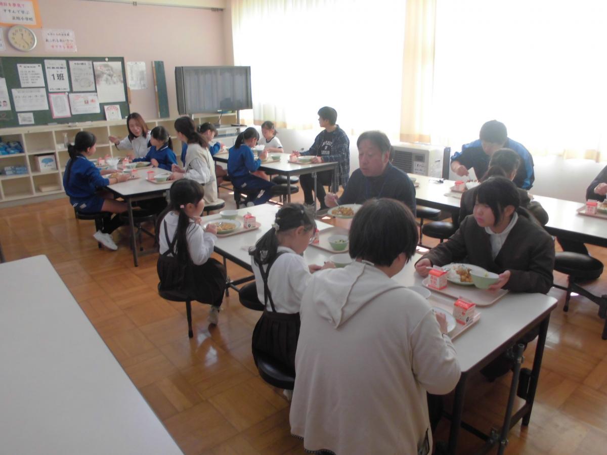 お米が炊きあがった頃には、ちょうど給食の時間。5名の皆さんも一緒に給食を味わっていただきました。久しぶりの給食を子どもたちと会話しながらおいしそうに食べて下さいました。
