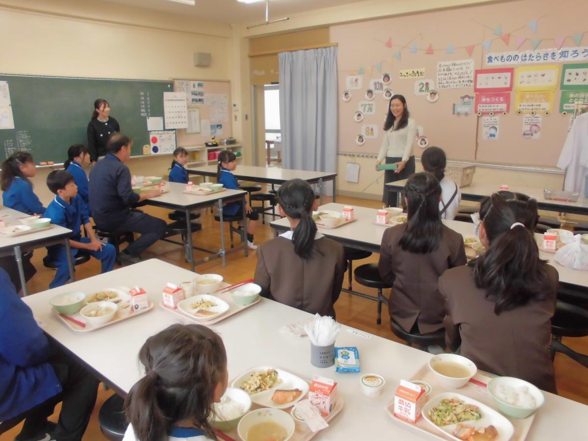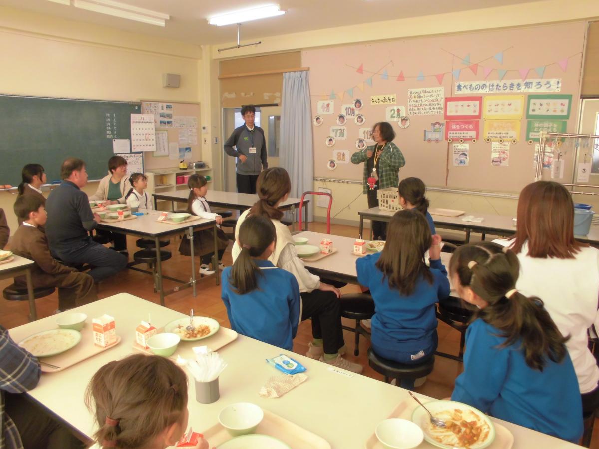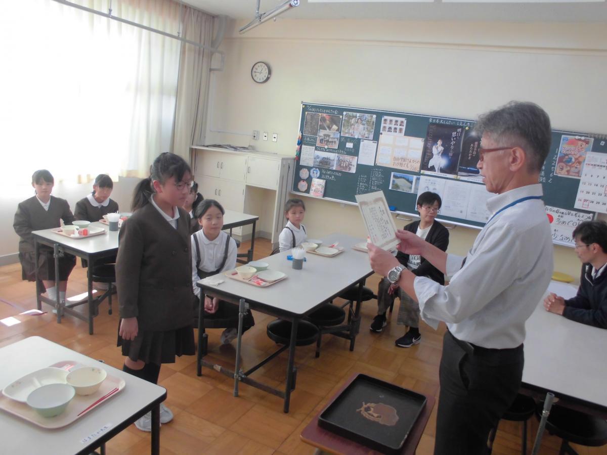 お米が炊きあがった頃には、ちょうど給食の時間。5名の皆さんも一緒に給食を味わっていただきました。久しぶりの給食を子どもたちと会話しながらおいしそうに食べて下さいました。