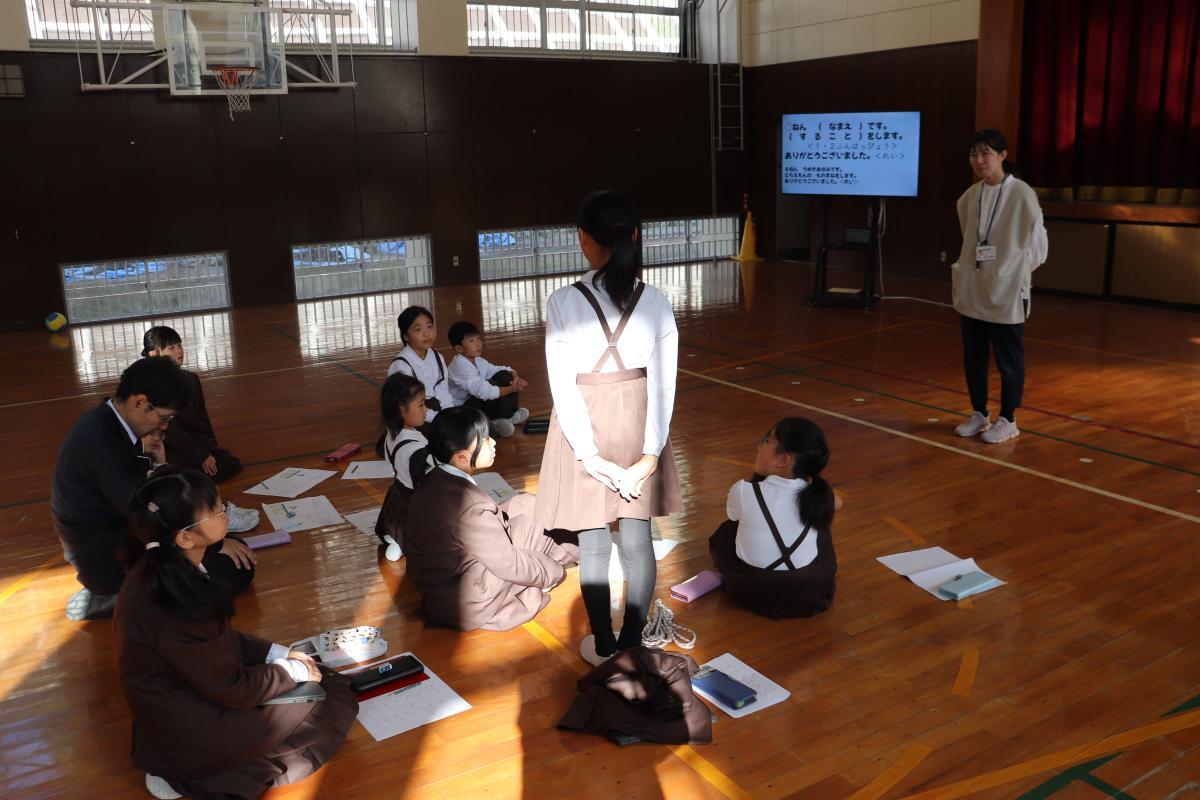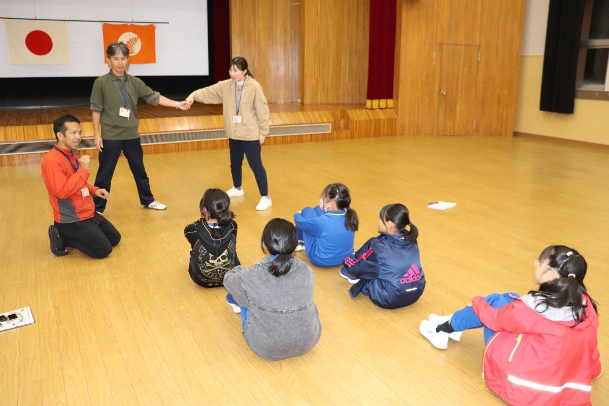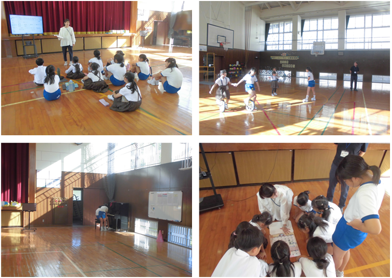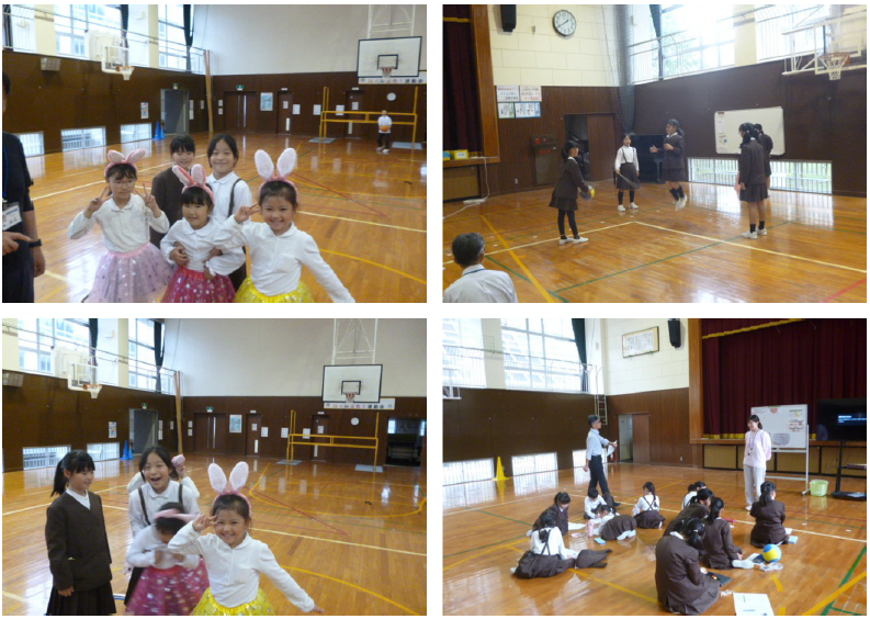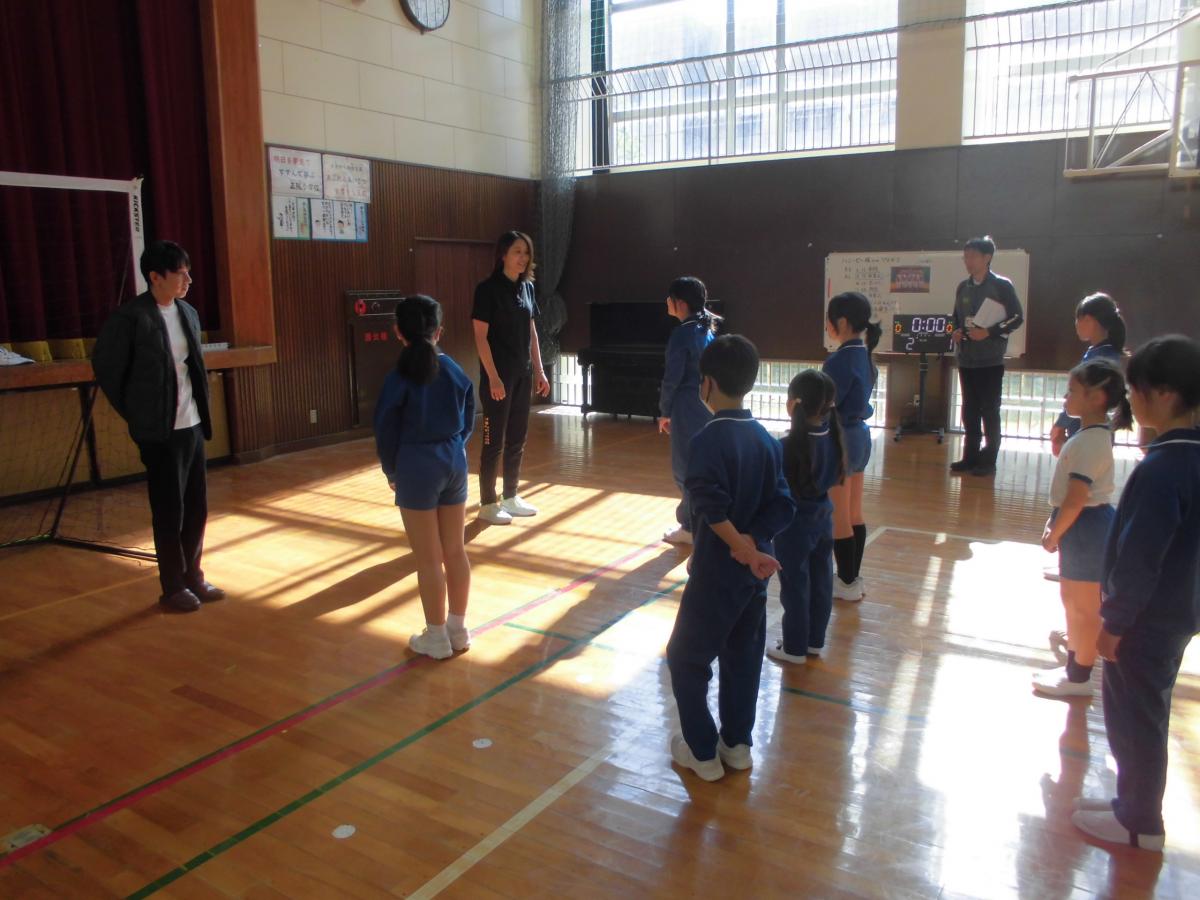 1時20分ごろには子どもたちも全員集まって、いよいよスポーツ教室。児童のあいさつで始まり、校長からはこの3年で4回目の来校であることに感謝を伝えました。その後、来校された16名の皆さんが自己紹介して下さいました。早速3チームに分かれて自己紹介等をした後、チーム名決め。「ねこ」「ゴーゴーイチゴ―」「ピザたくあん」に決まりました(笑)