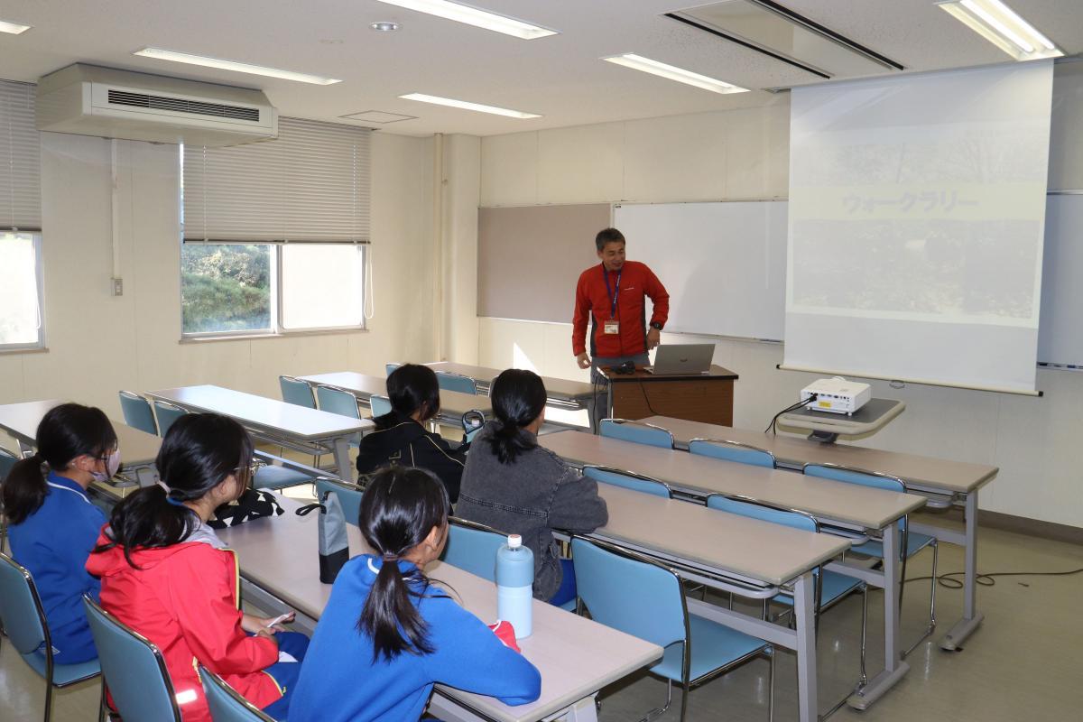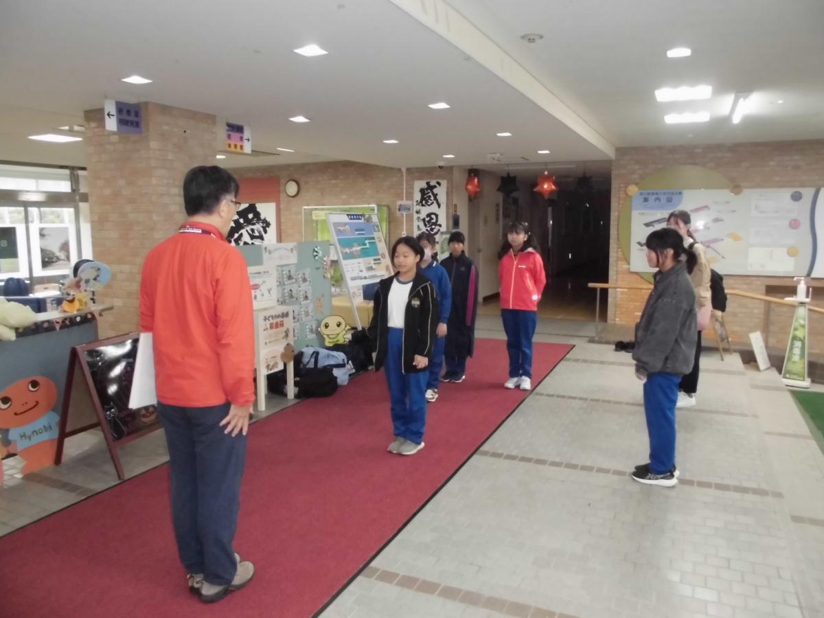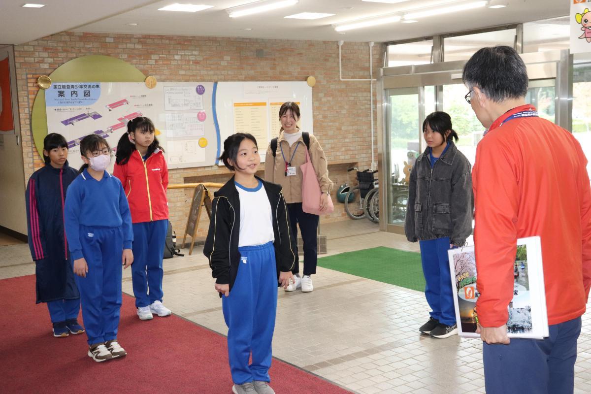 到着してすぐ、入所式。玄関で自然の家の所長さんからご挨拶をいただきました。自然の家で守る3つのこと、①元気にいろんな方と挨拶を交わすこと、②いろいろなことにチャレンジすること、③協力すれば仲良くなれるをお話いただきました。