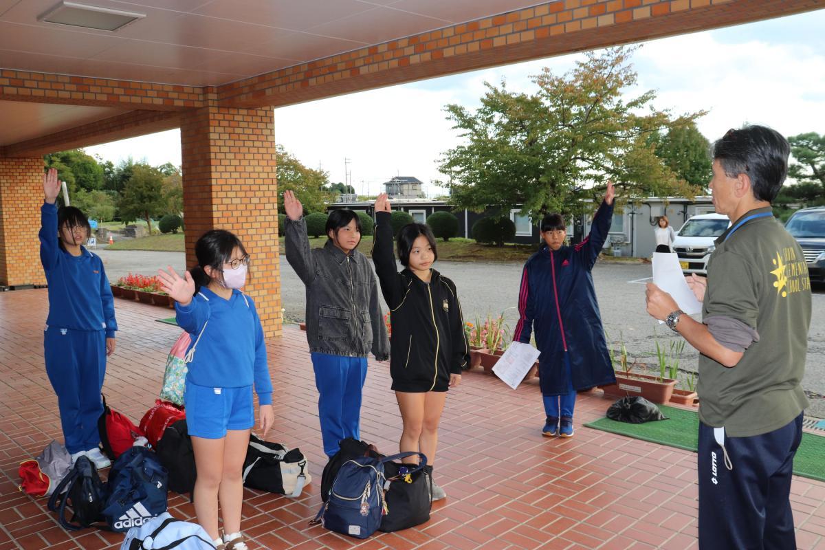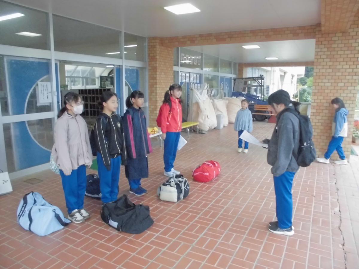 いつもより早い7時10分の登校でしたが、みんな笑顔で元気に登校。7時10分から学校前で出発式を行いました。校長からは3つのねらい、①里山里海のよさ・素晴らしさを感じること、②自ら目的をもって行動すること、③集団生活を通して交流し想い出を作ることを確認しました。