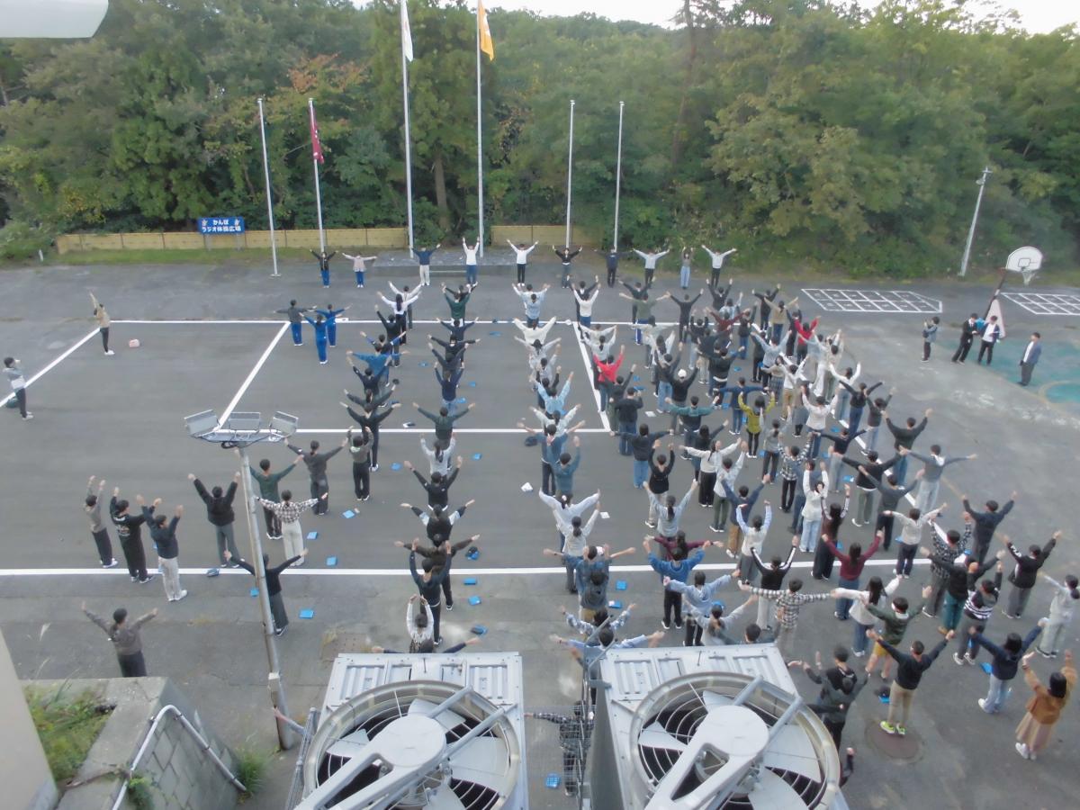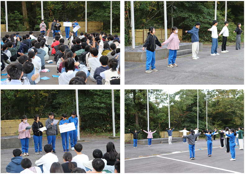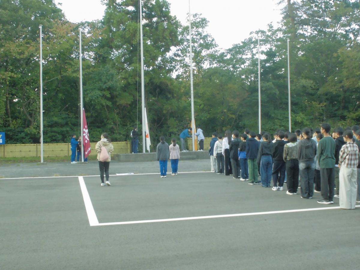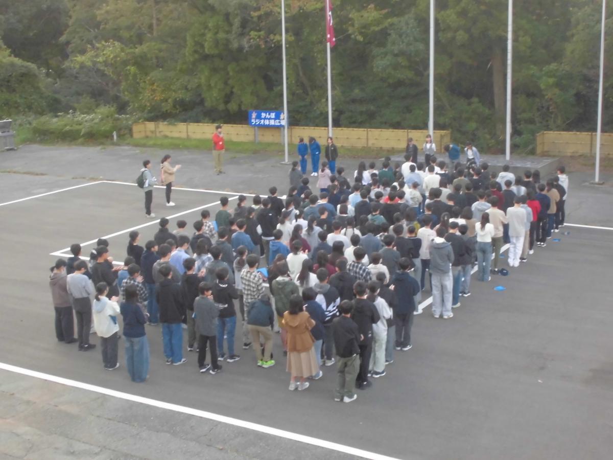 朝の掃除を終えて、7時から朝の集いがありました。一緒に宿泊した、富山大学附属中学校2年生の皆さんとの時間です。国旗・校旗を掲揚して、みんなで元気にラジオ体操を行いました。