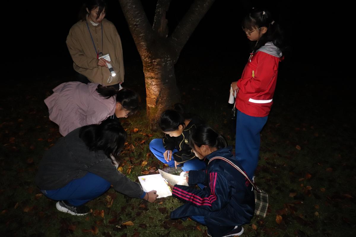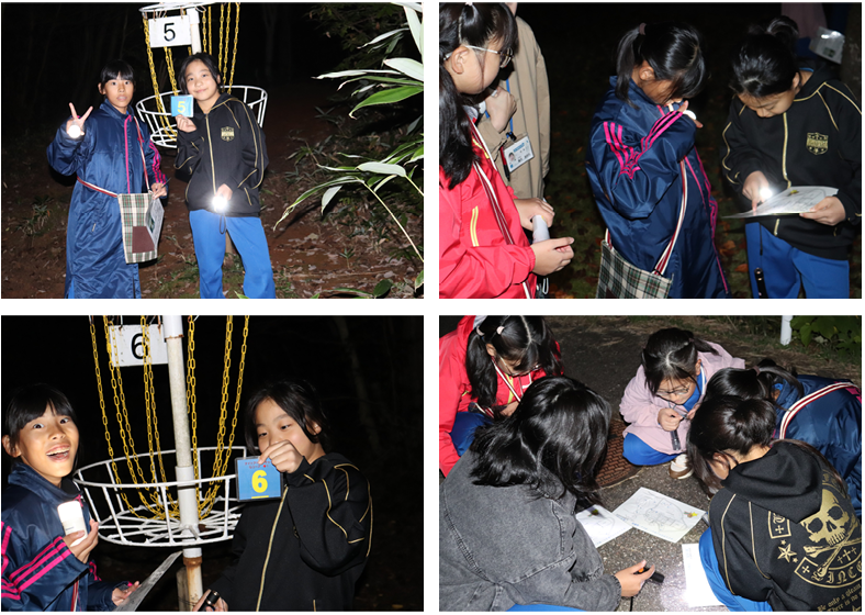 しばらく休憩のあとは、ナイトアドベンチャー。自然の家の周りに設置されているディスクゴルフのバスケットに入れられた7枚のカードを、地図をもとにみんなで協力して探しました。全員懐中電灯をもって約1時間活動し、5つのカードを見つけることができました!素晴らしい!