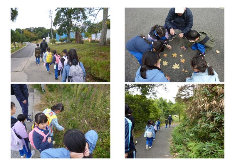 1年生から3年生で、野々江公園までの歩き遠足を行いました。今日は、3年生がリーダーとして、下級生を引っ張ってくれました。秋みつけをしながらだったので、歩きの途中でも立ち止まり、ねこじゃらしを触ったり、ススキを観察したりしました。セイタカアワダチソウは、すごい勢いで広がっていることもわかりました。野々江公園につくと、自分たちのみつけた秋について発表をしてくれました。オナモミやコオロギなどを話してくれました。レクリエーションでは、誰が一番赤色の葉をみつけるか、誰が一番黄色の葉をみつけるかをおこないました。そのほかにも鬼ごっこをおこないました。その後、亀ヶ谷池を散策しました。アケビをみつけたのですが、食べたことのない子もいて、本当にたべられるのと半信半疑の様子でした。その一方で、アケビをおかあさんのおみやげにする子もいました。最後は、遊具をつかっておもいっきり体を動かしていました。たのしい遠足になりました。