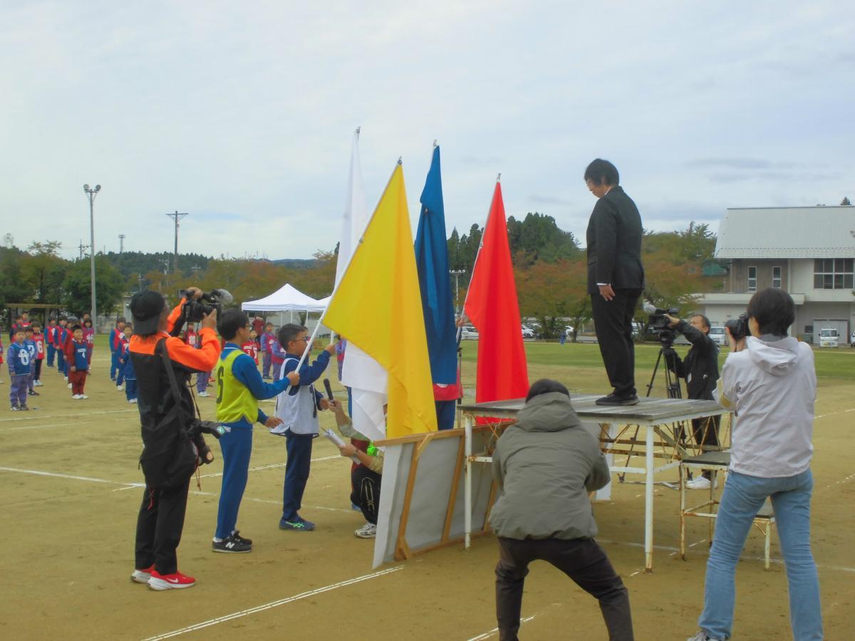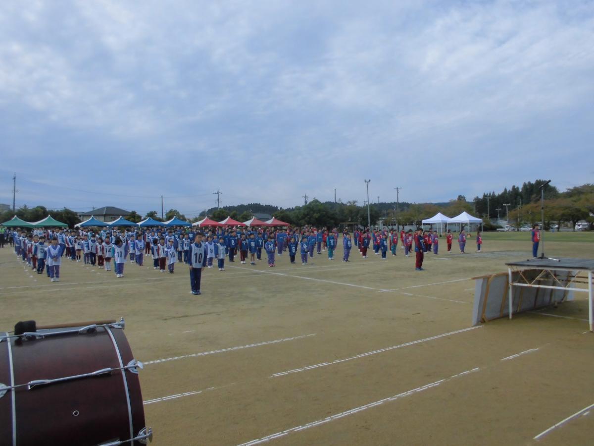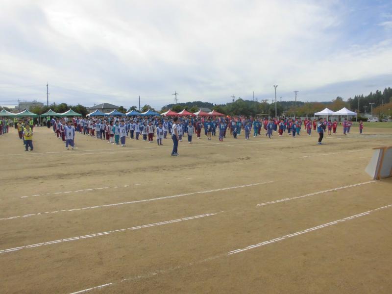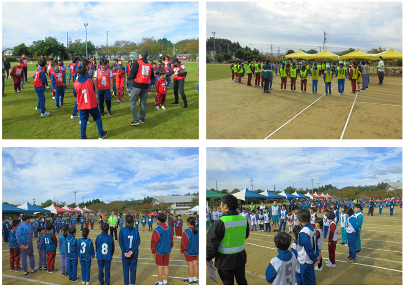 8時50分に整列して、開会式です。各チーム4列で堂々と入場できました。開会式では、実行委員長である校長先生や市長さん、市議会議長さん、教育長さんからの激励の言葉をいただき、いよいよ競技開始です。