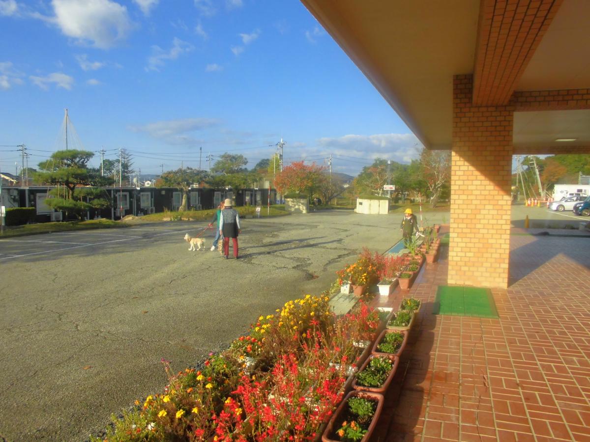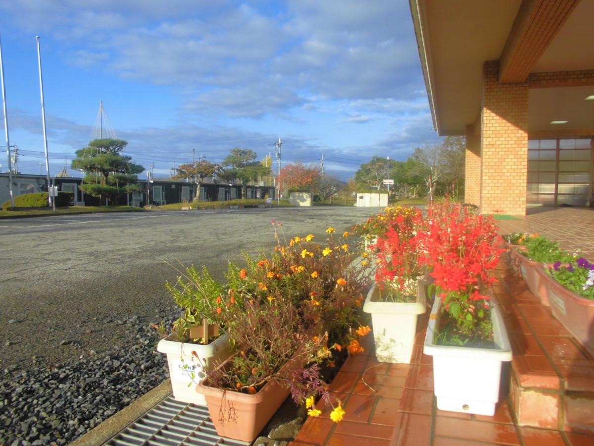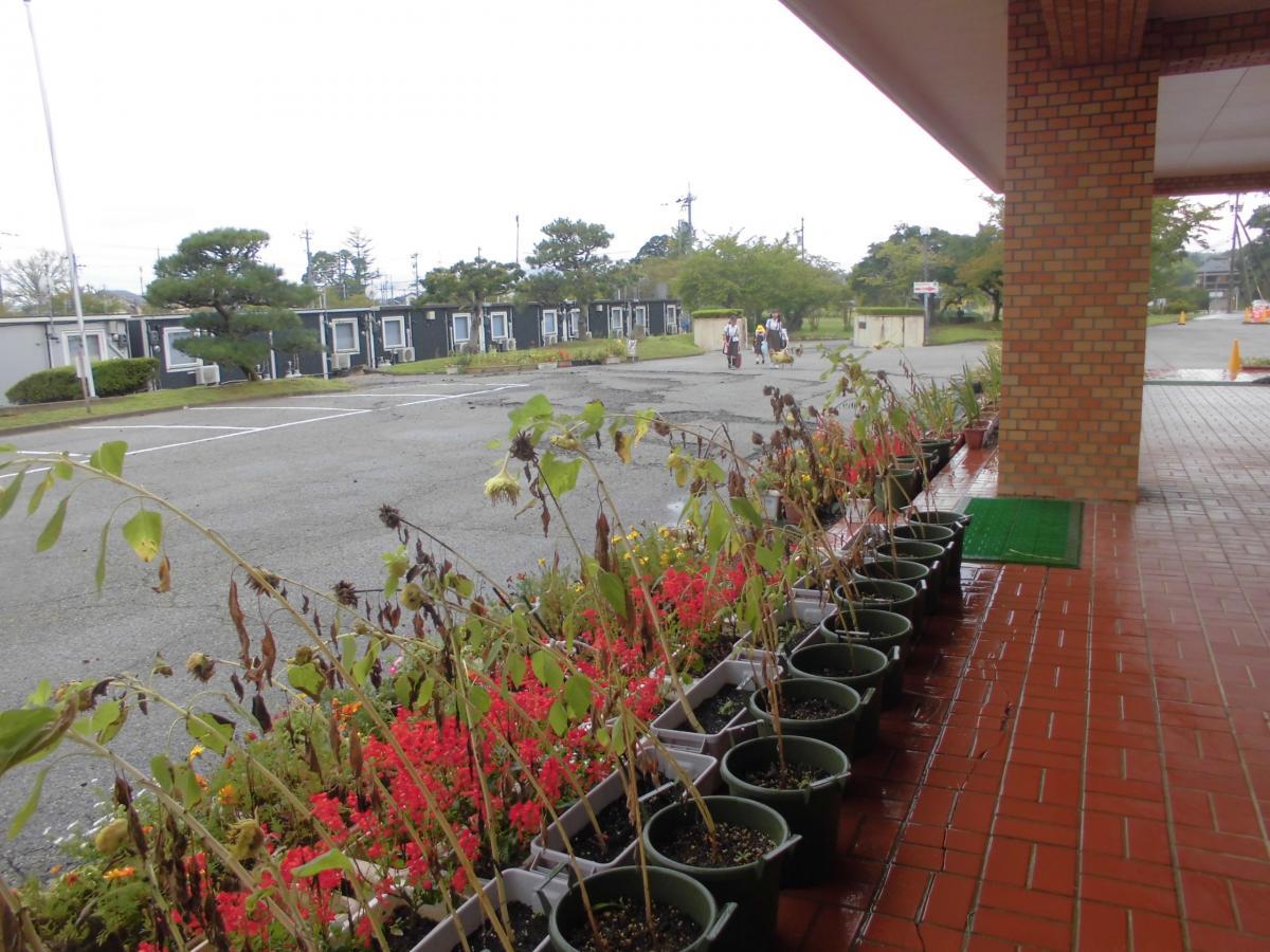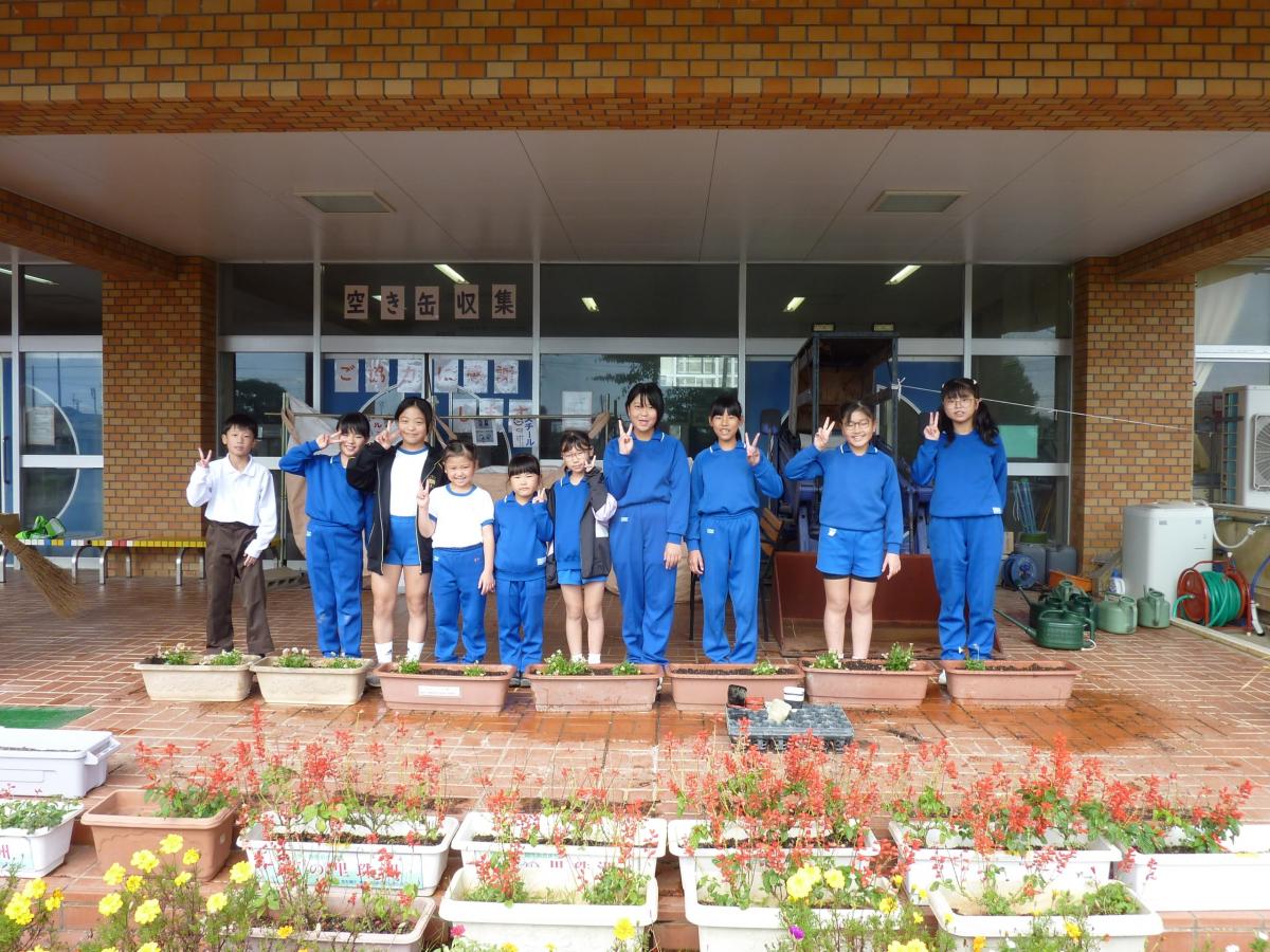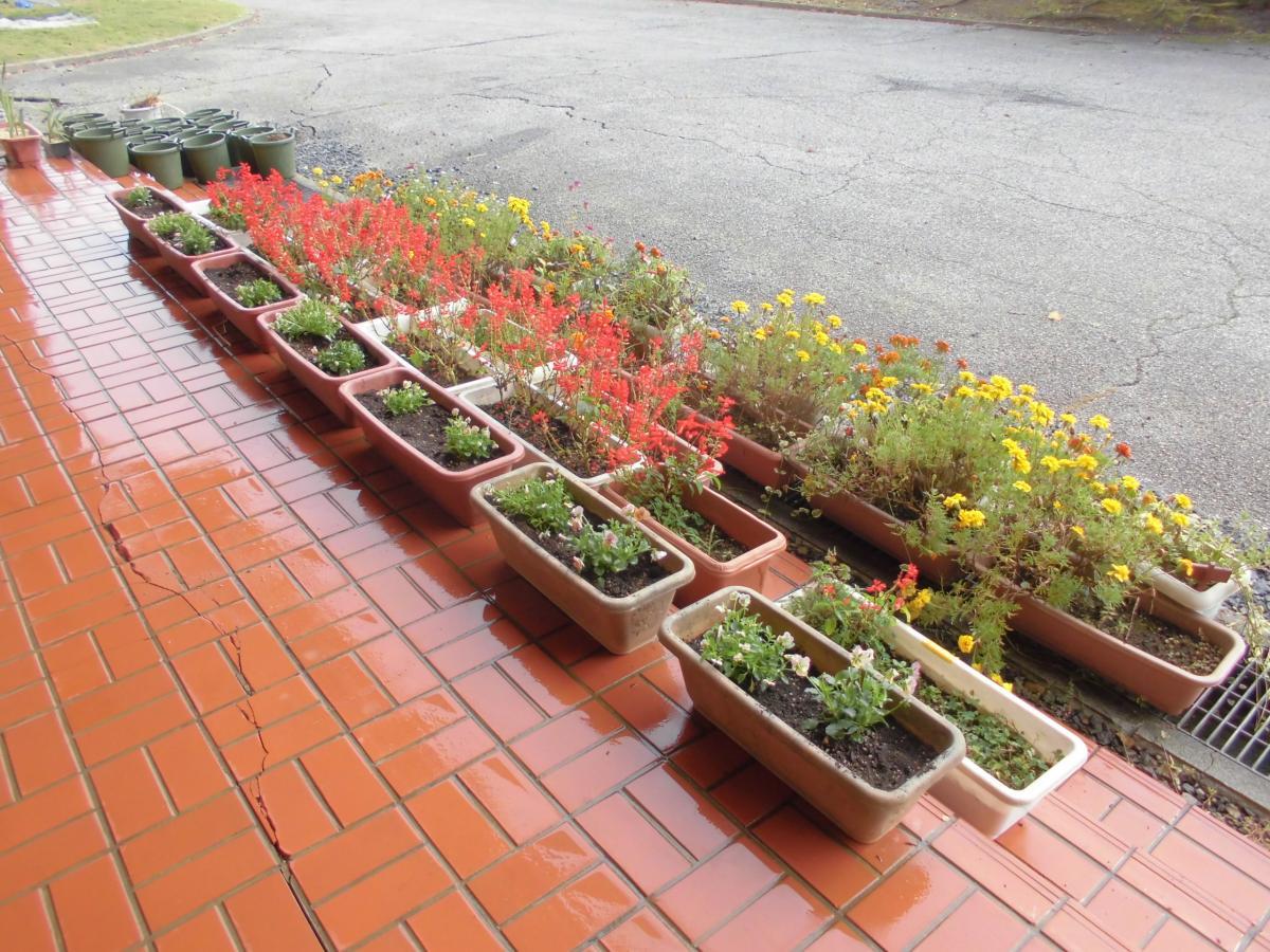 お昼休みには、花苗植えです。今までたくさん楽しませてくれたひまわりは、種をとるために刈り取り、正院町川尻の瀬戸さんから分けていただいた花苗をみんなで植えました。1人2鉢ずつ慣れた手つきで植えてくれました。