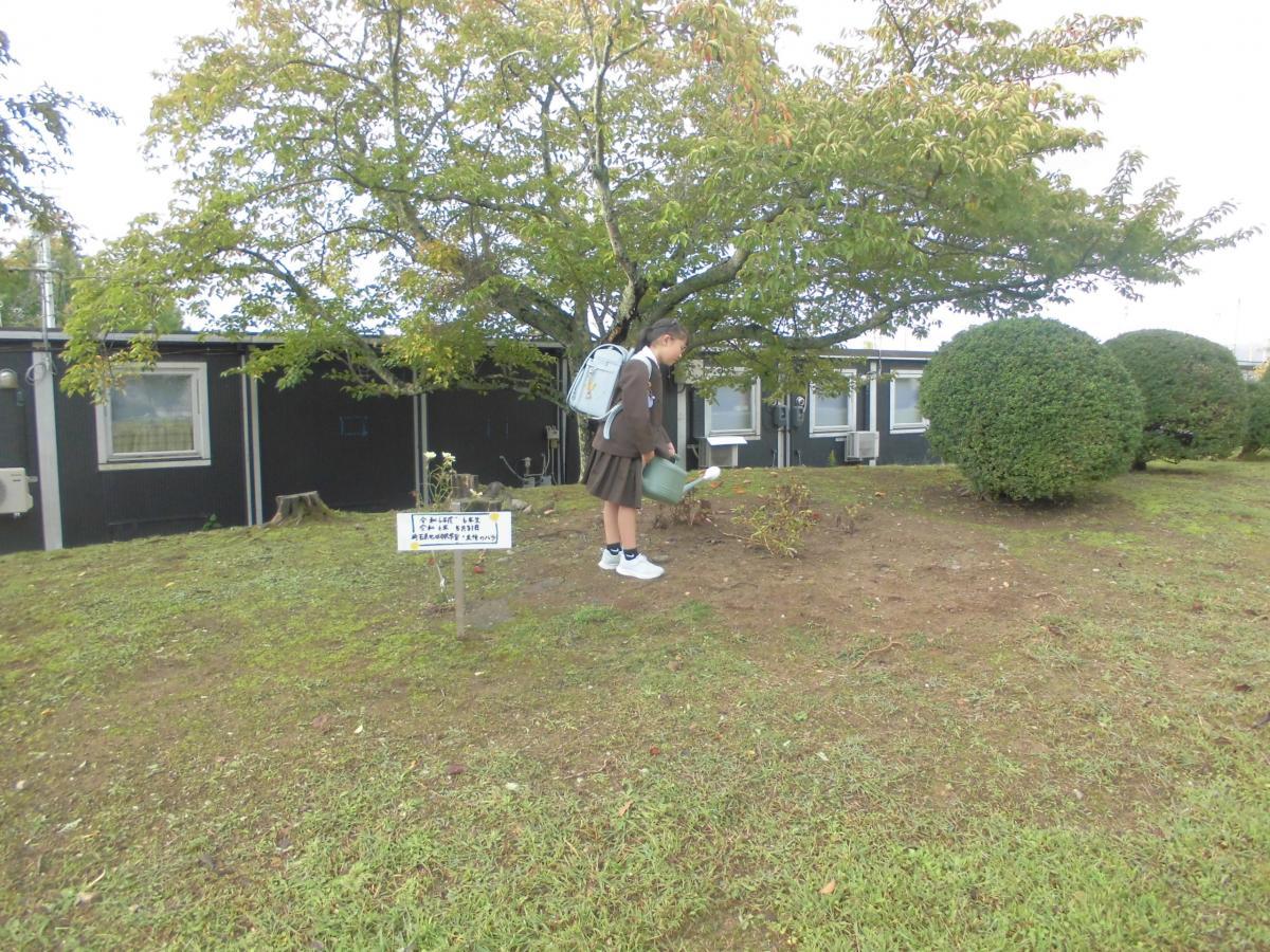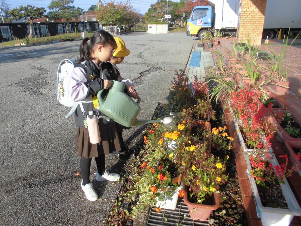 15日(水)、秋晴れのすがすがしい朝となりました。朝夕すっかり涼しくなり、すっかり季節は秋。3連休に加えて、運動会の代休があり、子どもたちは4連休明けの登校となりましたが、今日も朝から全員元気に登校してくれました、花丸◎!登校するといつも通りに玄関の花々の水やりに励み、みんなで久しぶりの再会を喜びながら校舎に入っていきました!