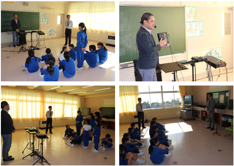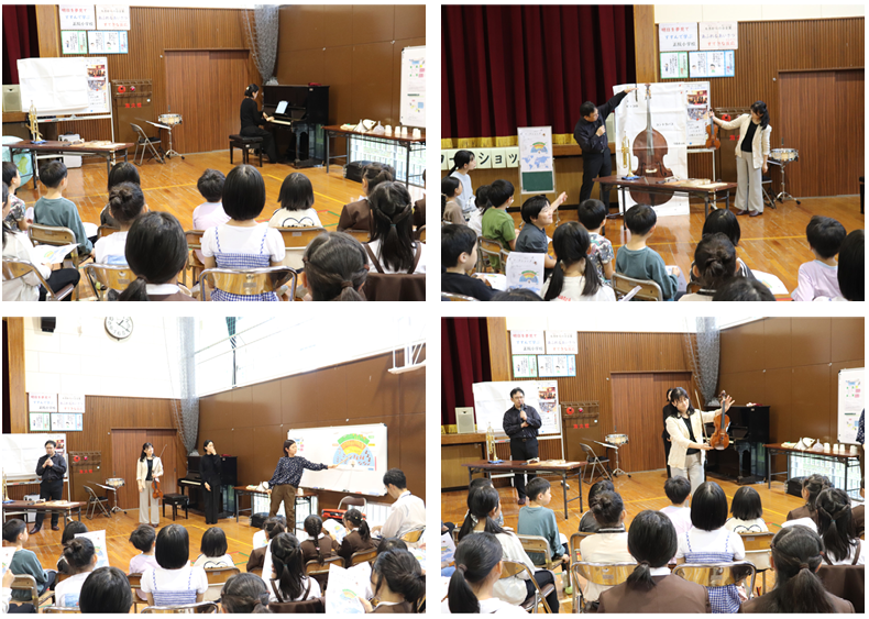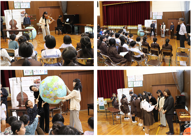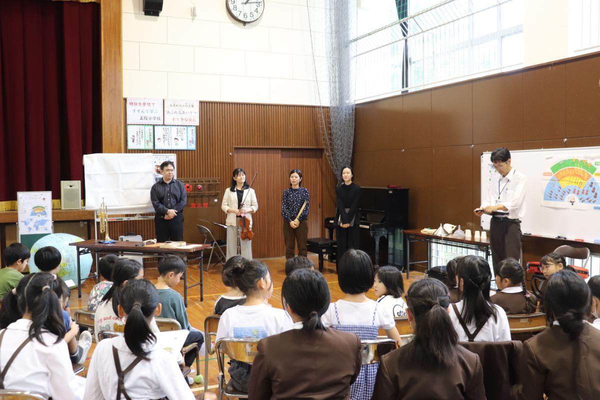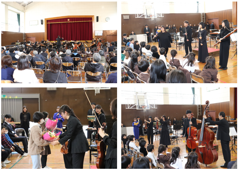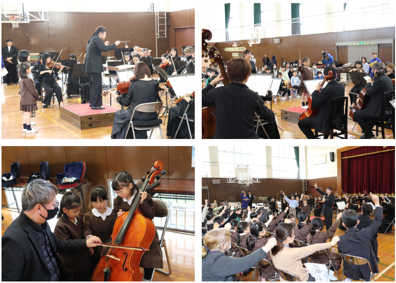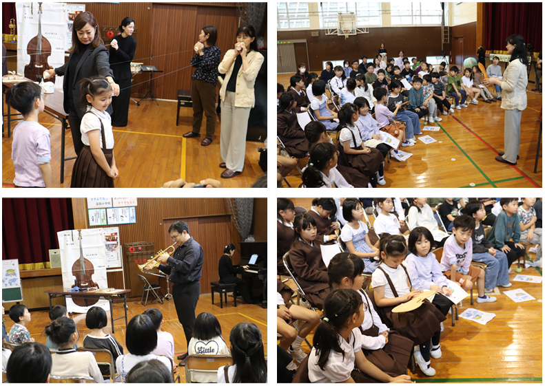 みさき小の皆さんにも声をかけてご来校いただき、一緒にオーケストラや楽器、クラシック音楽の歴史について学びました。今日ご来校下さったのは、4名の演奏家の皆さんと2名の事務局の方々でした。約90分楽しく学ぶことができました。特に印象に残ったのは、バイオリンを解剖した1つ1つの部品に触らせていただいたことや、バイオリンの弓が本当に馬のしっぽの毛でできていることを見せていただいたことです。今回の学びで、子どもたちはより一層オーケストラや楽器について関心を持つことができました!