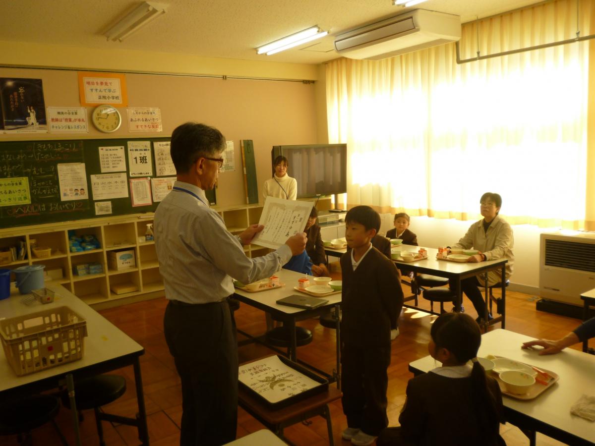 給食時には、5つの表彰がありました。県児童生徒科学作品コンクール、県児童硬筆書写コンクール、市読書感想画コンクール、市子ども美術展、防火標語コンクール。どのコンクールでもよく頑張りました、花丸◎!