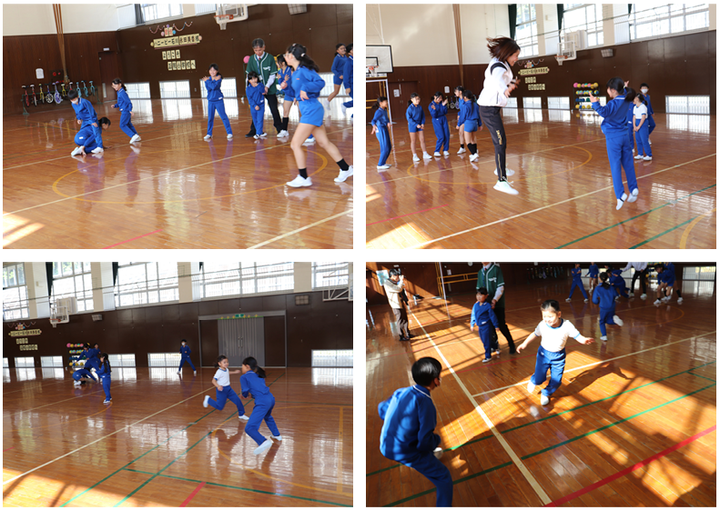 最初は3チーム対抗で、ミニ運動会。「じゃんけんリレー」や「しっぽ取り」、「ボールあて競争」に取り組みました。ハニービーの皆さんから子どもたちに声をかけたり、関わり合ったりしながら笑顔で楽しく競技を楽しむ様子が見られ、寒い体育館でしたが熱気はムンムン!子どもたちは、のどがかわくほど精一杯体を動かしていました。
