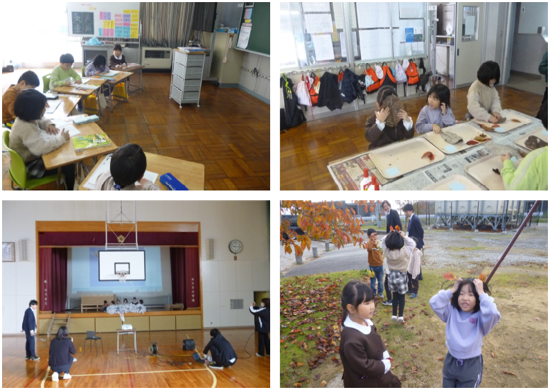 5限目の授業を見に行くと、1・2年生は生活科、秋に見つけたいろいろなものを使って、秋のおもちゃを作る計画を立てていました。3人がいろいろなアイディアを出し合って話し合う姿が見られました。3年生は外国語活動、大文字のアルファベットについて学んでいました。イラストから大文字のアルファベットを見つけて、そのアルファベットから始まる単語について学んでいました。5年生は理科、川のはたらきについての学習です。上流・中流・下流の川の様子のちがいを写真から比較し、考える姿が見られました!