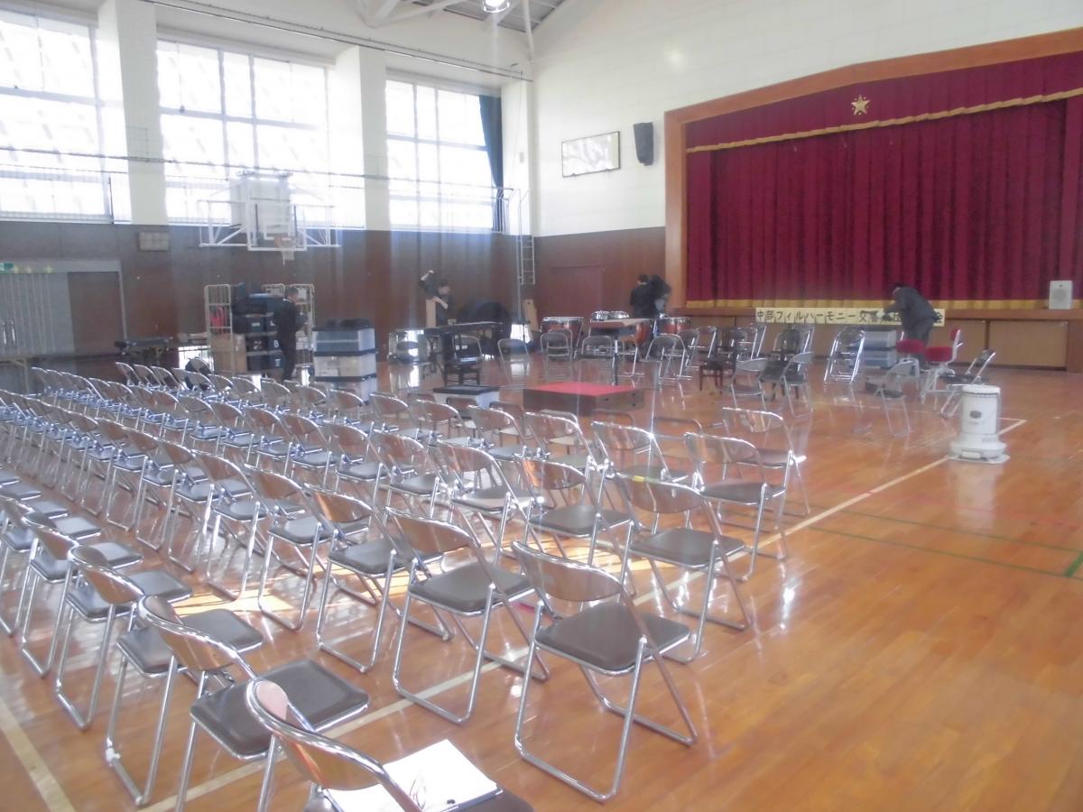 お昼過ぎ、長野県から日本防災士会長野県支部の皆さんが来校。着くなり、14時30分から予定している、復興応援みらいコンサートの準備をしていただきました。荷物の中にはたくさんのリンゴも。今日のコンサートの参加者にふるまっていただけるとのこと、大変ありがたい限りです!