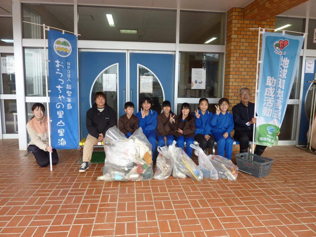 学校玄関の空き缶収集もアルミ缶2袋がいっぱいに。地域の皆さんのご協力に深く感謝です!