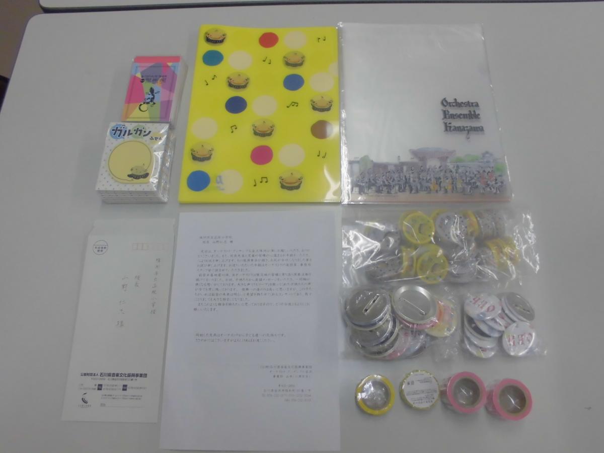 ◇オーケストラアンサンブル金沢様…クリアファイル・付箋・缶バッジ等→10月10日にラポルトすずにて市内の子どもたちのために、オーケストラアンサンブル金沢様が演奏会を開催して下さいました。その感想をお贈りしたところ、そのお礼として子どもたちが喜ぶ文具が届きました!