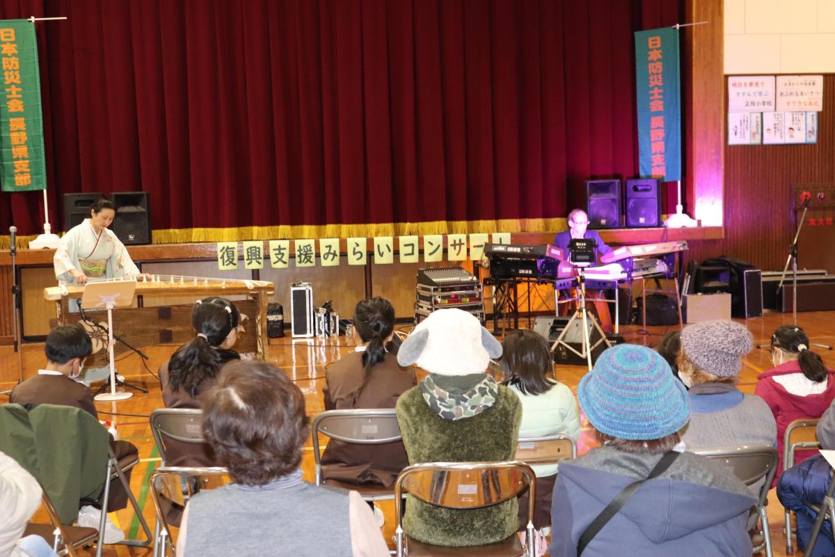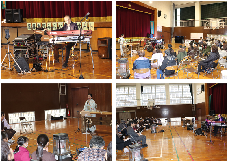 14時30分より、復興応援みらいコンサートが行われました。今回の出演者はシンセサイザー奏者・影武者様と、琴奏者の清水範子様です。影武者様は今回が初めての来校、清水様は昨年3月以来2回目のコンサートです。約1時間半、じっくりとお二人の演奏を楽しみました。シンセサイザーや琴の音色に包まれて、温かく穏やかな時間を過ごすことができました。