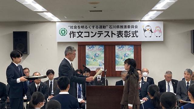 給食を終えたタイミングで、本校の学校評議員の干場さんが来校され、子どもたちにお礼のあいさつをしたいとのこと。毎年本校の交通安全教室に大型バスを持ち込んでバスの死角について学習をさせていただいてきたことが、県交通安全協会より表彰されたとのこと。受けた賞は、「交通安全上野賞」。石川県交通安全協会会長よりいただく、特別賞とのこと。本当に素晴らしいことです!これからも子どもたちのためにぜひご協力いただければありがたく思います!