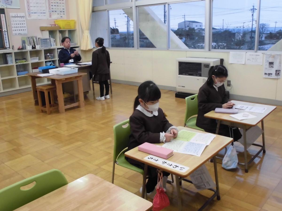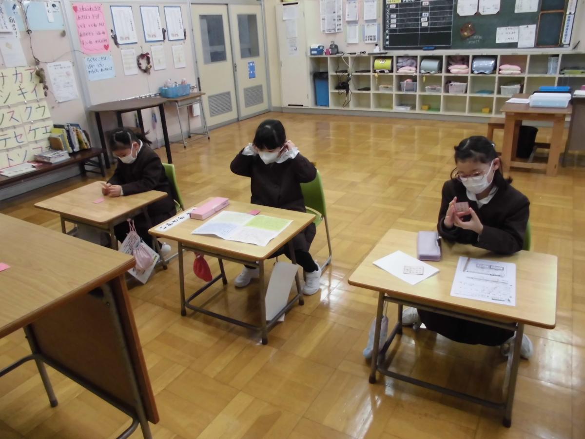6限目の様子を見に行くと、2年生は算数、九九を使って解く文章問題を考えていました、1つ分、いくつ分を考えながら九九で解く姿が見られました、花丸◎!3・5年生は書写、書き初めの練習でした。3年生は「友だち」、5年生は「新しい風」。さて、1月8日にはどんな作品となるでしょうか、今から楽しみです!