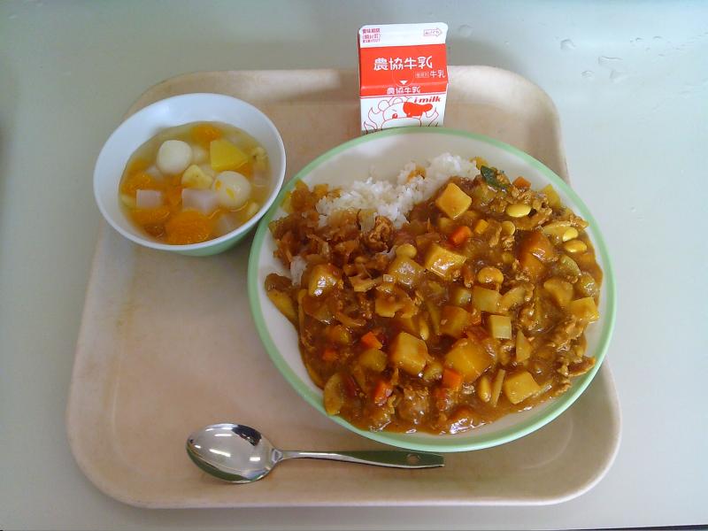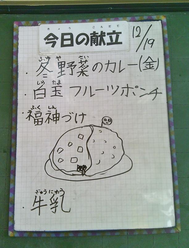 1週間ぶりの更新となります。失礼しました。本日の献立は、冬野菜のカレー・白玉フルーツポンチ・福神漬・牛乳でした。カレーの冬野菜には、レンコン・大根・さつまいも・ごぼう・かぼちゃが入っています。かぼちゃ以外は根野菜といって体をあたためる効果があります。寒い冬にぴったりのメニューですね。ランチルームの献立表には素敵なイラスト入りです。5年生2人が描いてくれました。カラーではないのですが、おいしそうな雰囲気が出ていますね。今日もおいしくいただきました!