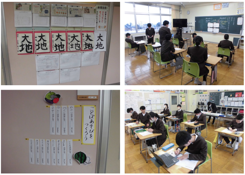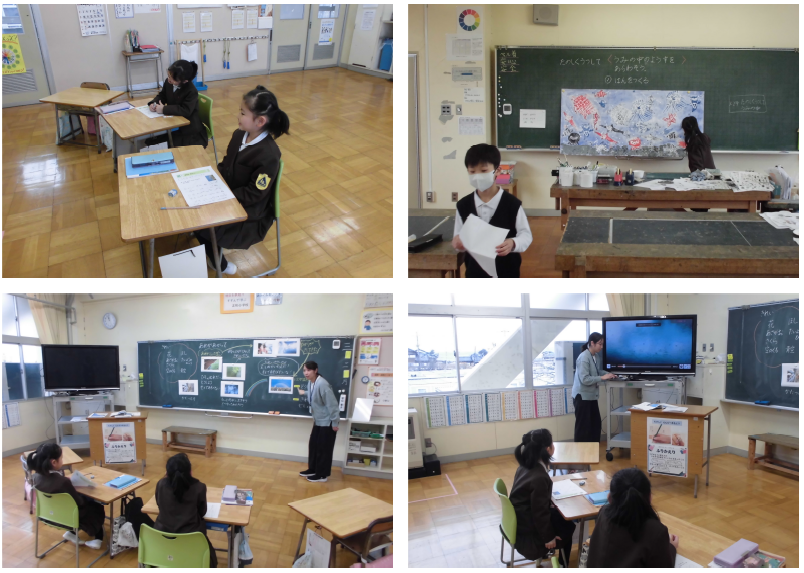 4年生も国語、単元は「風船でちきゅうへ」、範読を聞きながら、興味を持った部分を見つける学習です。6年生に紹介するために、集中して線を引く聞く姿が見られました。6年生も国語、単元は「日本の文字文化」、日本の文字の特徴をつかむ学習です。日本語にある「漢字」「ひらがな」「カタカナ」等について、その由来や特徴を考える姿がありました。