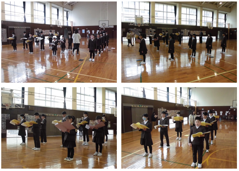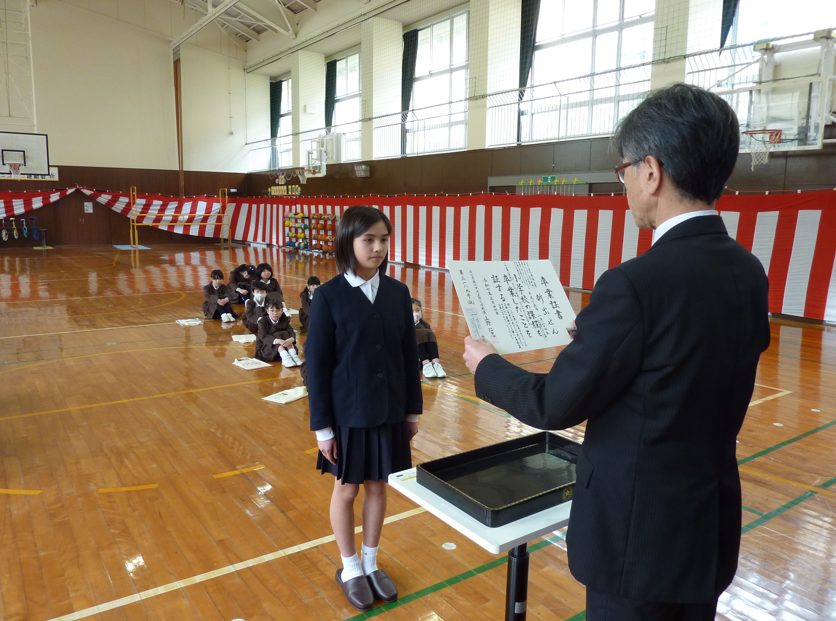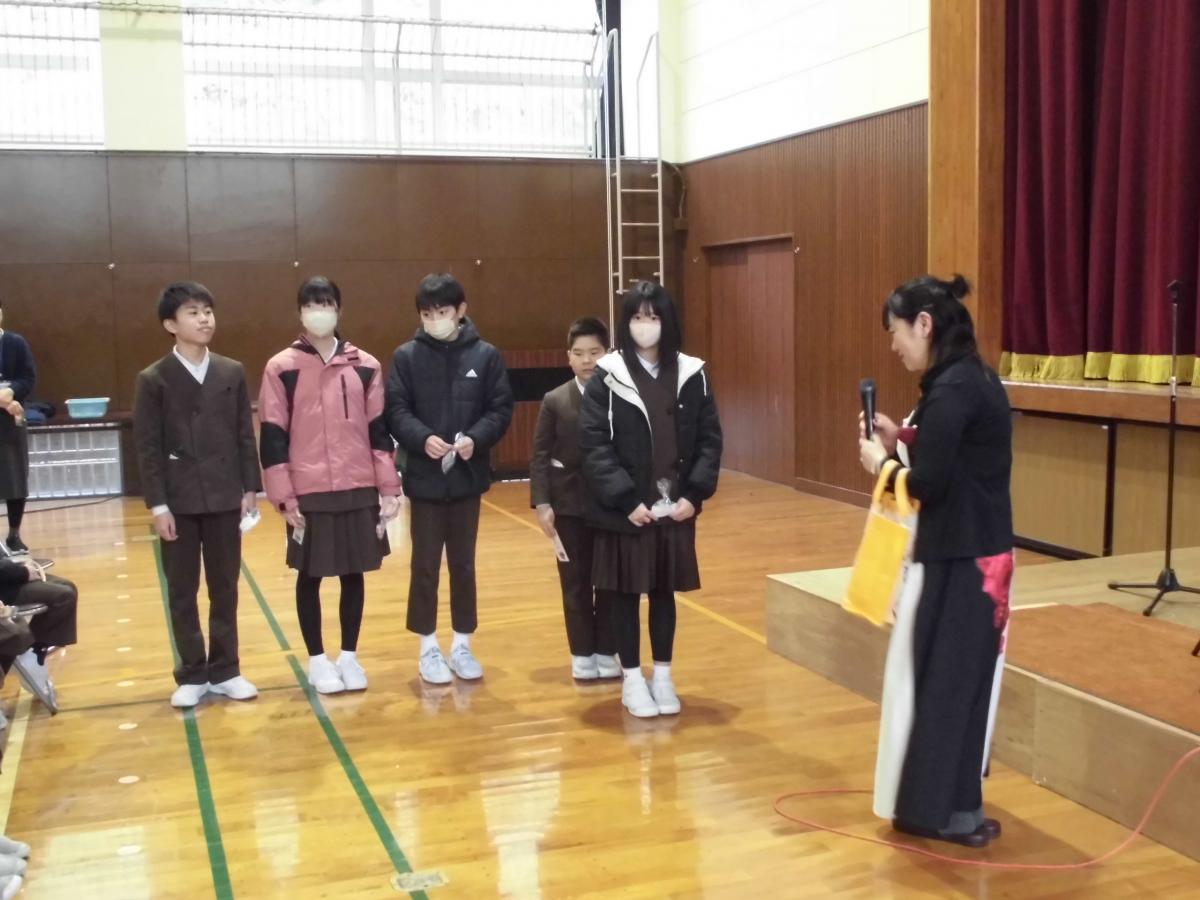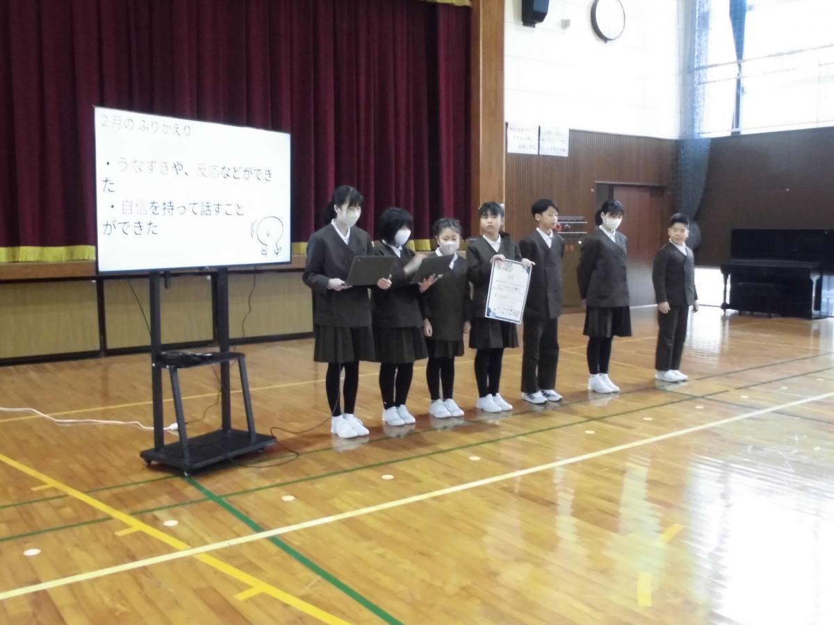 最初に表彰、先日行った校内百人一首かるた大会の表彰です。低学年の部・高学年の部1位の児童に表彰を渡しました。少人数であっても、ベストを尽くして競い合う経験は大切にしたいと感じています。