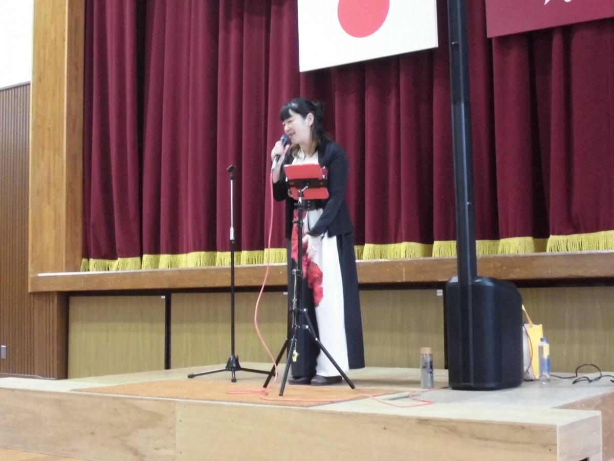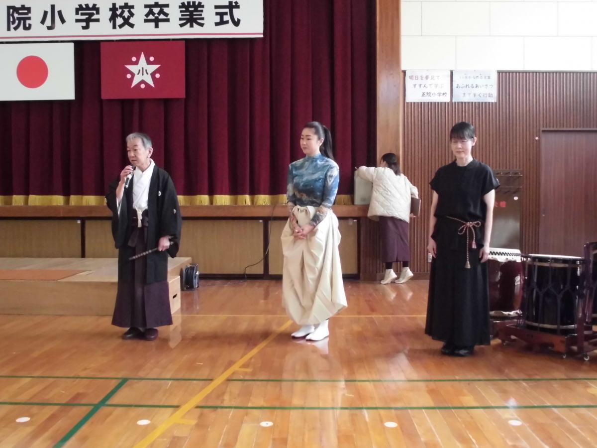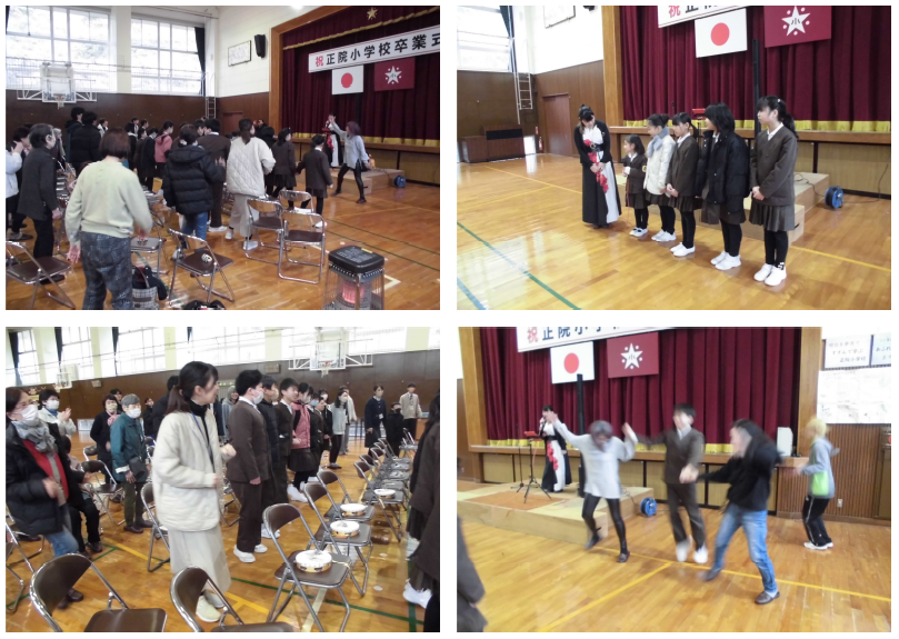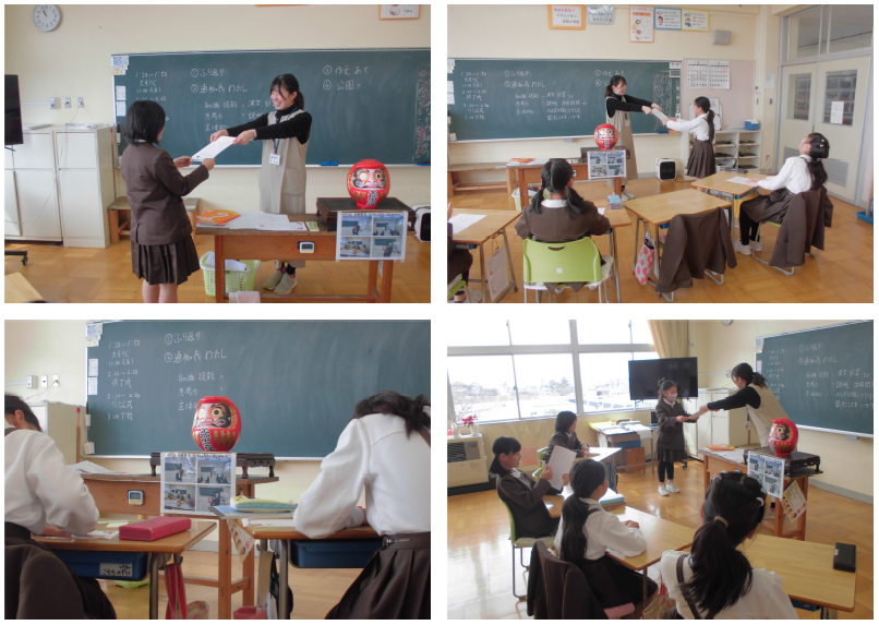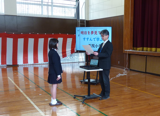 最初に表彰、先日行った校内百人一首かるた大会の表彰です。低学年の部・高学年の部1位の児童に表彰を渡しました。少人数であっても、ベストを尽くして競い合う経験は大切にしたいと感じています。