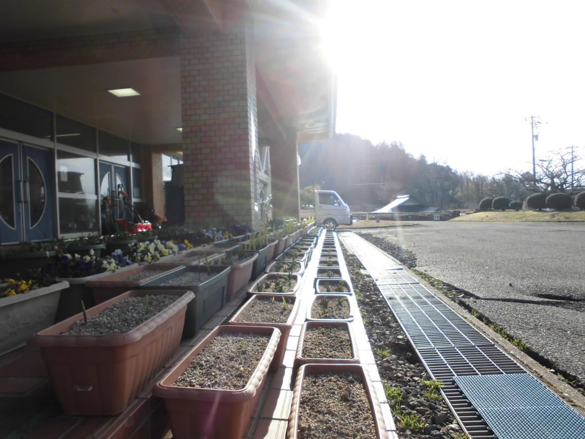 23日(木)、今日は曇り空の朝となりました。埼玉県・地球市民学習さんにからいただいた薔薇も、寒さを耐えてがんばっています!また玄関の花たちは、雪から守るために屋根の下に入れてありますが、雨があたらないため少し元気がないようでした。そこで、久しぶりに水やりをしてあげました。玄関には、先日の日曜日に、正院町子ども会で能登島に出かけ、その時作った素敵なガラス作品が並んでいました。