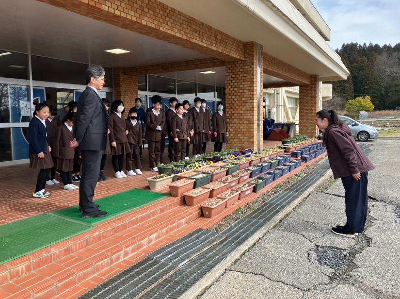 8日(火)、今日は1学期2日目、今朝は曇り空でしたが、空気は春の気配。学校の桜は2分咲きといったところでしょうか。今日から朝の交通安全指導が始まりました。今日は正院駐在所さんと校長、5年生児童1名で行いました。新学期を迎え、徒歩で歩く子が。いいですね。いつも通りの学校生活が戻ってきているって感じる微笑ましい姿でした。また、1年生もお母さんと一緒に徒歩で登校。2年生が早速玄関までお迎えに来てくれました。玄関に戻ってくると、自らプランターの花に水やりしてくれる子も。素晴らしい光景から今日も1日始まりました、花丸◎!