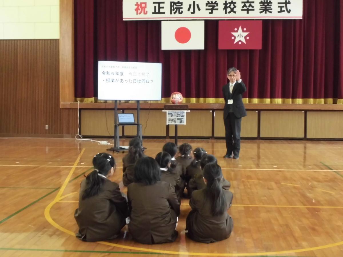 新しい4名の先生方を加えて、始業式です。校長からは3点、①今年度のみんなとのスローガンは【明日を夢見てすすんで学ぶ正院小学校】であること、②特別な日常…何気ない毎日が特別なことであると日々感謝し、精一杯生きることが大切であること、③入学式での式辞でみなさんにお願いしたいことの3つを話しました。②特別な日常については明日から朝の放送を再開し、みんなにお願いしたいと話すと、5年生が引き受けてくれました。